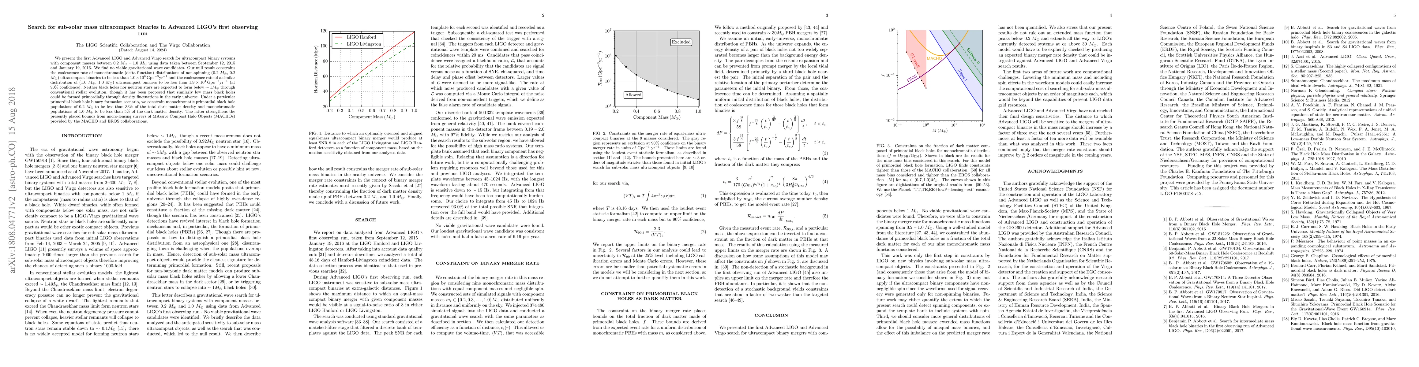 We present the first Advanced LIGO and Advanced Virgo search for ultracompact binary systems with component masses between 0.2 $M_\odot$ - 1.0 $M_\odot$ using data taken between September 12, 2015 and January 19, 2016. We find no viable gravitational wave candidates. Our null result constrains the coalescence rate of monochromatic (delta function) distributions of non-spinning (0.2 $M_\odot$, 0.2 $M_\odot$) ultracompact binaries to be less than $1.0 \times 10^6 \text{Gpc}^{-3} \text{yr}^{-1}$ and the coalescence rate of a similar distribution of (1.0 $M_\odot$, 1.0 $M_\odot$) ultracompact binaries to be less than $1.9 \times 10^4 \text{Gpc}^{-3} \text{yr}^{-1}$ (at 90 percent confidence). Neither black holes nor neutron stars are expected to form below ~ 1 solar mass through conventional stellar evolution, though it has been proposed that similarly low mass black holes could be formed primordially through density fluctuations in the early universe. Under a particular primordial black hole binary formation scenario, we constrain monochromatic primordial black hole populations of 0.2 $M_\odot$ to be less than $33\%$ of the total dark matter density and monochromatic populations of 1.0 $M_\odot$ to be less than $5\%$ of the dark matter density. The latter strengthens the presently placed bounds from micro-lensing surveys of MAssive Compact Halo Objects (MACHOs) provided by the MACHO and EROS collaborations.