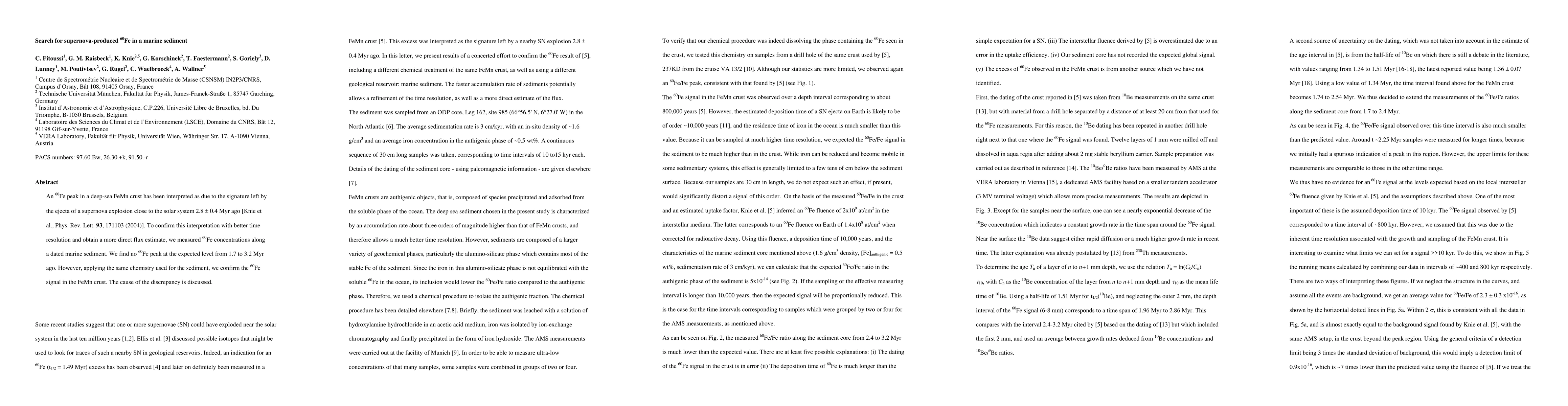An 60Fe peak in a deep-sea FeMn crust has been interpreted as due to the signature left by the ejecta of a supernova explosion close to the solar system 2.8 +/- 0.4 Myr ago [Knie et al., Phys. Rev. Lett. 93, 171103 (2004)]. To confirm this interpretation with better time resolution and obtain a more direct flux estimate, we measured 60Fe concentrations along a dated marine sediment. We find no 60Fe peak at the expected level from 1.7 to 3.2 Myr ago. However, applying the same chemistry used for the sediment, we confirm the 60Fe signal in the FeMn crust. The cause of the discrepancy is discussed.