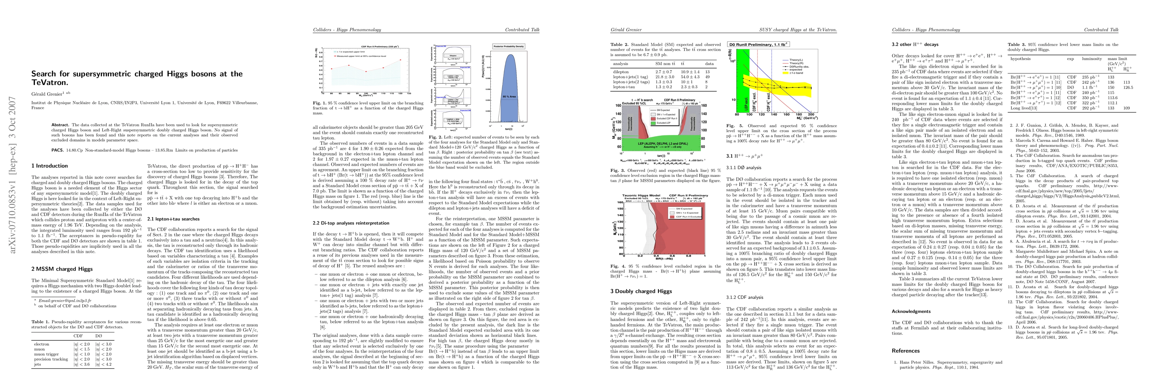 A search for supersymmetric charged Higgs bosons at the TeVatron found no signal, reporting on current analyses and excluded models' parameter space.