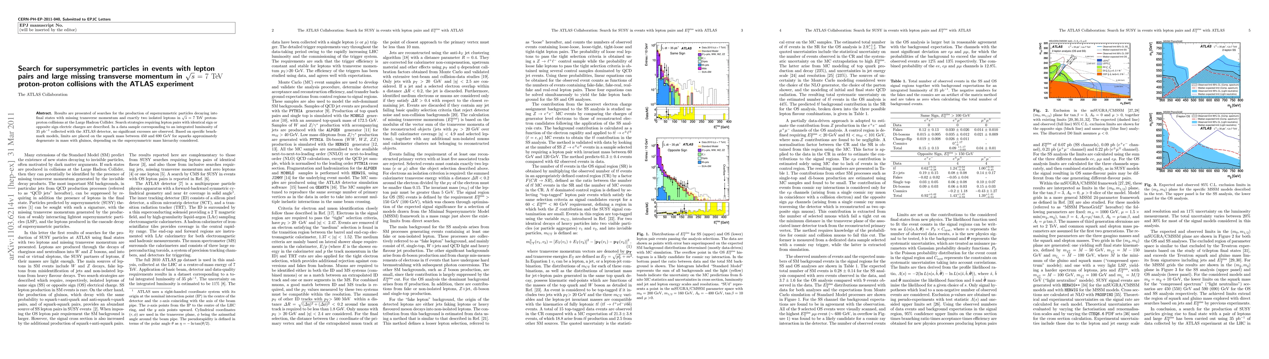 The research utilized proton-proton collision data at sqrt{s} = 7 TeV collected with the ATLAS detector at the Large Hadron Collider (LHC), focusing on events with lepton pairs and large missing transverse momentum as signatures of supersymmetric particles.