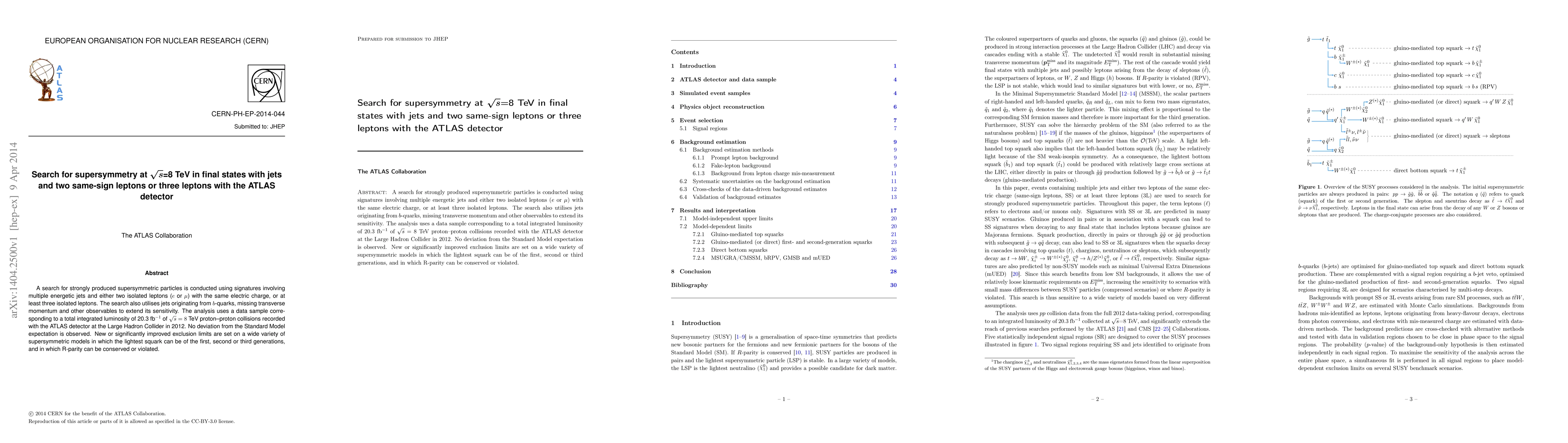 A search for strongly produced supersymmetric particles is conducted using signatures involving multiple energetic jets and either two isolated leptons ($e$ or $\mu$) with the same electric charge, or at least three isolated leptons. The search also utilises jets originating from b-quarks, missing transverse momentum and other observables to extend its sensitivity. The analysis uses a data sample corresponding to a total integrated luminosity of 20.3 fb$^{-1}$ of $\sqrt{s} =$ 8 TeV proton-proton collisions recorded with the ATLAS detector at the Large Hadron Collider in 2012. No deviation from the Standard Model expectation is observed. New or significantly improved exclusion limits are set on a wide variety of supersymmetric models in which the lightest squark can be of the first, second or third generations, and in which R-parity can be conserved or violated.