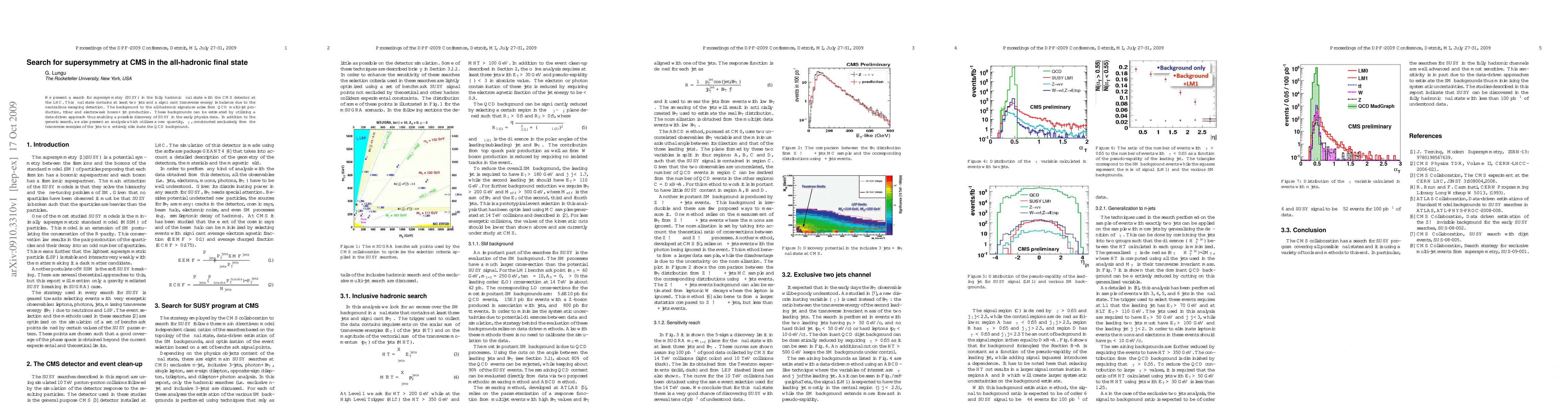 We present a search for supersymmetry (SUSY) in the fully hadronic final state with the CMS detector at the LHC. This final state contains at least two jets and a significant transverse energy imbalance due to neutralinos escaping detection. The background to all-hadronic signature arise from QCD multijet production, ttbar and electroweak boson+jet production. These background can be estimated by utilizing a data-driven approach using events thus enabling a possible discovery of SUSY in the early physics data. In addition to the generic search, we also present an analysis which utilizes a new quantity, alpha_T, constructed exclusively from the transverse energies of the jets to effectively eliminate the QCD background.