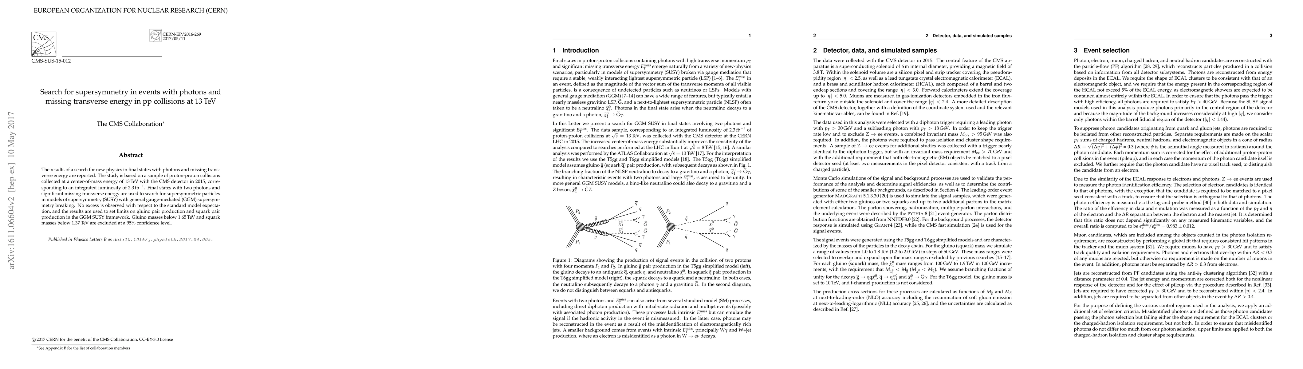 This paper reports a search for supersymmetry in proton-proton collisions at 13 TeV, focusing on events with two photons and significant missing transverse energy. No new physics signals are observed, leading to exclusion limits on gluino and squark masses in the general gauge-mediated supersymmetry breaking framework.