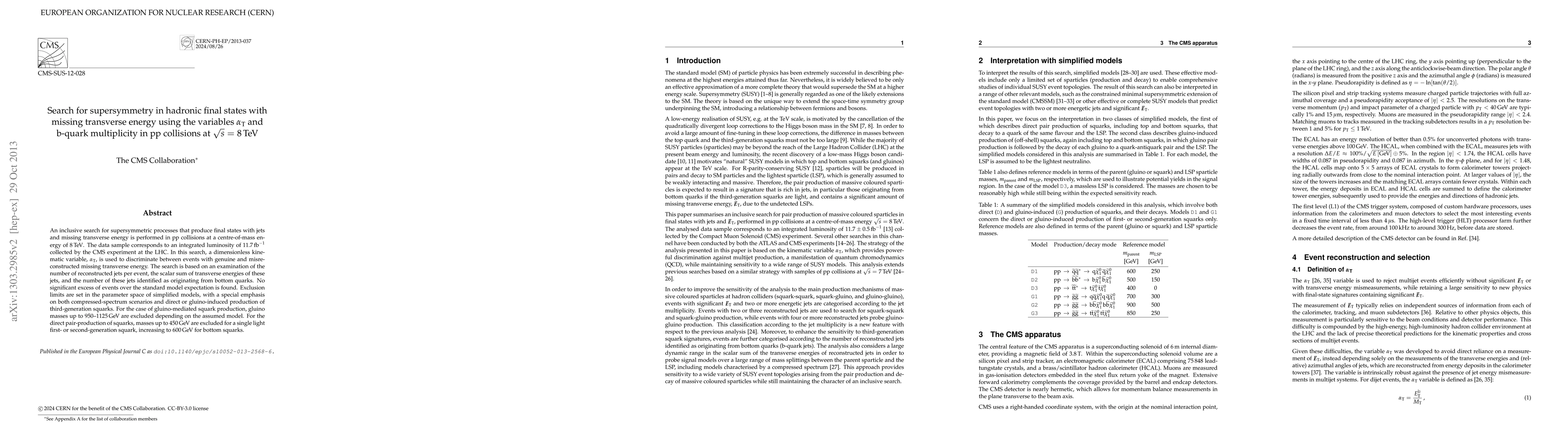 An inclusive search for supersymmetric processes that produce final states with jets and missing transverse energy is performed in pp collisions at a centre-of-mass energy of 8 TeV. The data sample corresponds to an integrated luminosity of 11.7 inverse femtobarns collected by the CMS experiment at the LHC. In this search, a dimensionless kinematic variable, AlphaT, is used to discriminate between events with genuine and misreconstructed missing transverse energy. The search is based on an examination of the number of reconstructed jets per event, the scalar sum of transverse energies of these jets, and the number of these jets identified as originating from bottom quarks. No significant excess of events over the standard model expectation is found. Exclusion limits are set in the parameter space of simplified models, with a special emphasis on both compressed-spectrum scenarios and direct or gluino-induced production of third-generation squarks. For the case of gluino-mediated squark production, gluino masses up to 950-1125 GeV are excluded depending on the assumed model. For the direct pair-production of squarks, masses up to 450 GeV are excluded for a single light first- or second-generation squark, increasing to 600\GeV for bottom squarks.