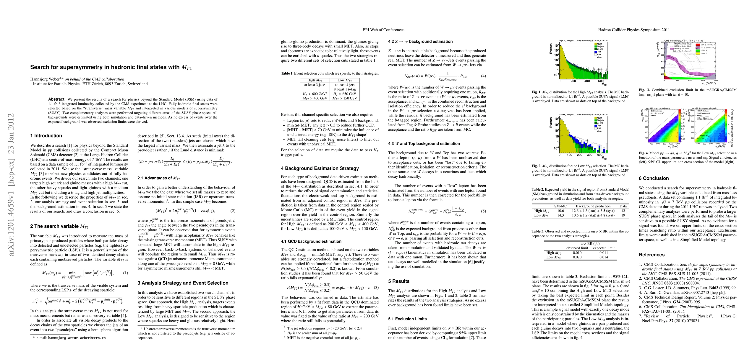 Researchers used CMS experiment data to search for supersymmetry in hadronic final states, finding no evidence of excess events over expected backgrounds.