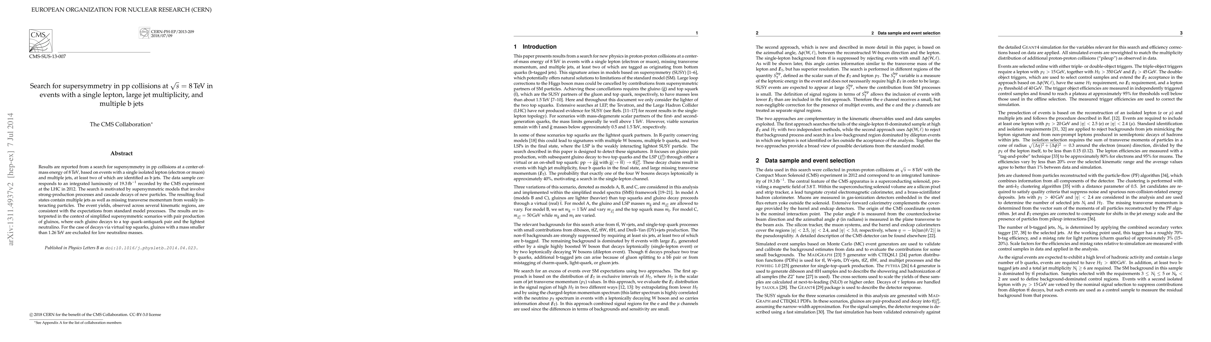 Results are reported from a search for supersymmetry in pp collisions at a center-of-mass energy of 8 TeV, based on events with a single isolated lepton (electron or muon) and multiple jets, at least two of which are identified as b jets. The data sample corresponds to an integrated luminosity of 19.3 inverse femtobarns recorded by the CMS experiment at the LHC in 2012. The search is motivated by supersymmetric models that involve strong-production processes and cascade decays of new particles. The resulting final states contain multiple jets as well as missing transverse momentum from weakly interacting particles. The event yields, observed across several kinematic regions, are consistent with the expectations from standard model processes. The results are interpreted in the context of simplified supersymmetric scenarios with pair production of gluinos, where each gluino decays to a top quark-antiquark pair and the lightest neutralino. For the case of decays via virtual top squarks, gluinos with a mass smaller than 1.26 TeV are excluded for low neutralino masses.