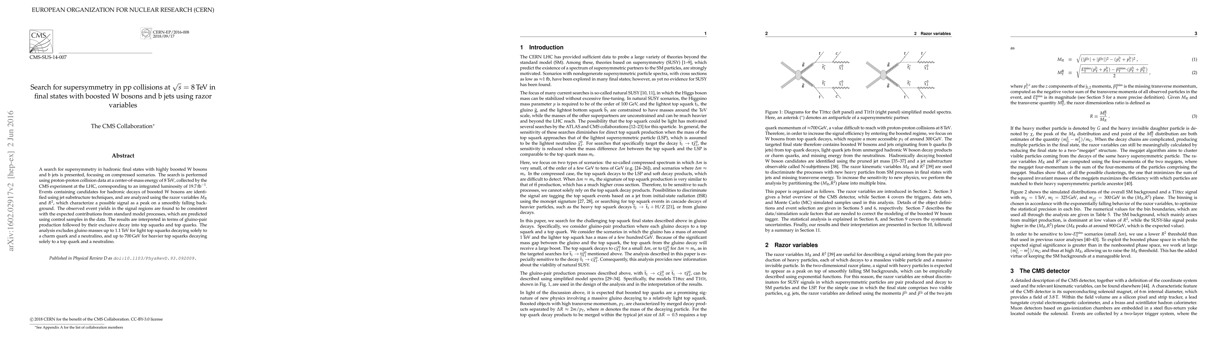 A search for supersymmetry in hadronic final states with highly boosted W bosons and b jets is presented, focusing on compressed scenarios. The search is performed using proton-proton collision data at a center-of-mass energy of 8 TeV, collected by the CMS experiment at the LHC, corresponding to an integrated luminosity of 19.7 inverse femtobarns. Events containing candidates for hadronic decays of boosted W bosons are identified using jet substructure techniques, and are analyzed using the razor variables M[R] and R^2, which characterize a possible signal as a peak on a smoothly falling background. The observed event yields in the signal regions are found to be consistent with the expected contributions from standard model processes, which are predicted using control samples in the data. The results are interpreted in terms of gluino-pair production followed by their exclusive decay into top squarks and top quarks. The analysis excludes gluino masses up to 1.1 TeV for light top squarks decaying solely to a charm quark and a neutralino, and up to 700 GeV for heavier top squarks decaying solely to a top quark and a neutralino.