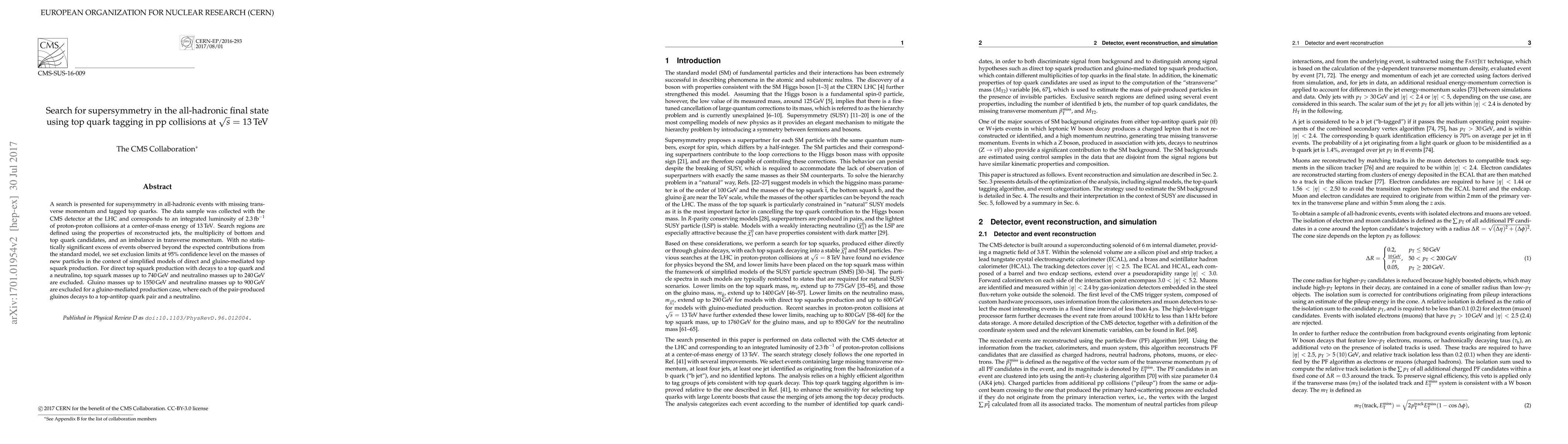 This paper reports a search for supersymmetry in all-hadronic events using the CMS detector at the LHC, focusing on top quark tagging in proton-proton collisions at 13 TeV. No significant excess beyond standard model predictions is observed, leading to exclusion limits on the masses of new particles in simplified models of direct and gluino-mediated top squark production.