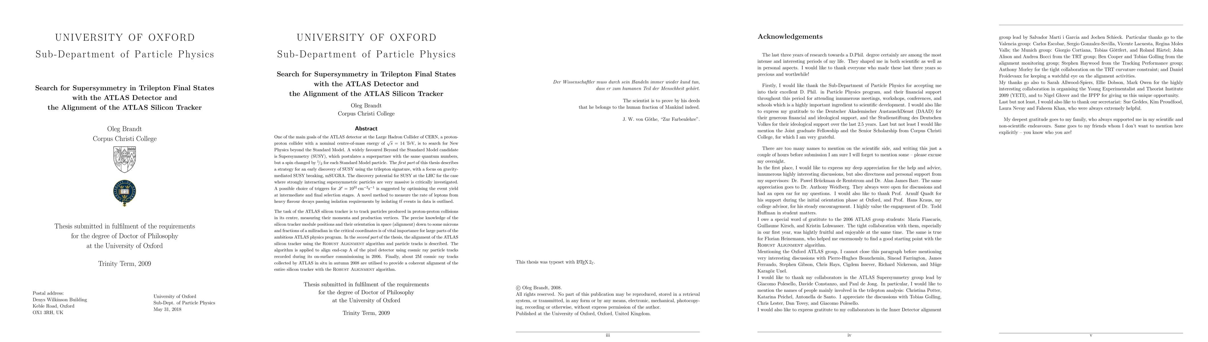 One of the main goals of the ATLAS detector at the LHC of CERN, a proton-proton collider with a nominal centre-of-mass energy of 14 TeV, is to search for New Physics beyond the Standard Model (BSM). A widely favoured BSM candidate is Supersymmetry (SUSY), which postulates a superpartner for each Standard Model particle. The first part of this thesis describes a strategy for an early discovery of SUSY using the trilepton signature, with a focus on gravity-mediated SUSY breaking, mSUGRA. The discovery potential for SUSY for the case where strongly interacting supersymmetric particles are very massive is critically investigated. A possible choice of triggers for L = 10-31cm-2s-1 is suggested by optimising the event yield at intermediate and final selection stages. A novel method to measure the rate of leptons from heavy flavour decays passing isolation requirements by isolating tt events in data is outlined. The task of the ATLAS silicon tracker is to track particles produced in proton-proton collisions in its centre, measuring their momenta and production vertices. The precise knowledge of the silicon tracker module positions and their orientation in space (alignment) down to some microns and fractions of a miliradian in the critical coordinates is of vital importance for large parts of the ambitious ATLAS physics program. In the second part of the thesis, the alignment of the ATLAS silicon tracker using the Robust Alignment algorithm and particle tracks is described. The algorithm is applied to align end-cap A of the pixel detector using cosmic ray particle tracks recorded during its on-surface commissioning in 2006. Finally, about 2M cosmic ray tracks collected by ATLAS in situ in autumn 2008 are utilised to provide a coherent alignment of the entire silicon tracker with the Robust Alignment algorithm.