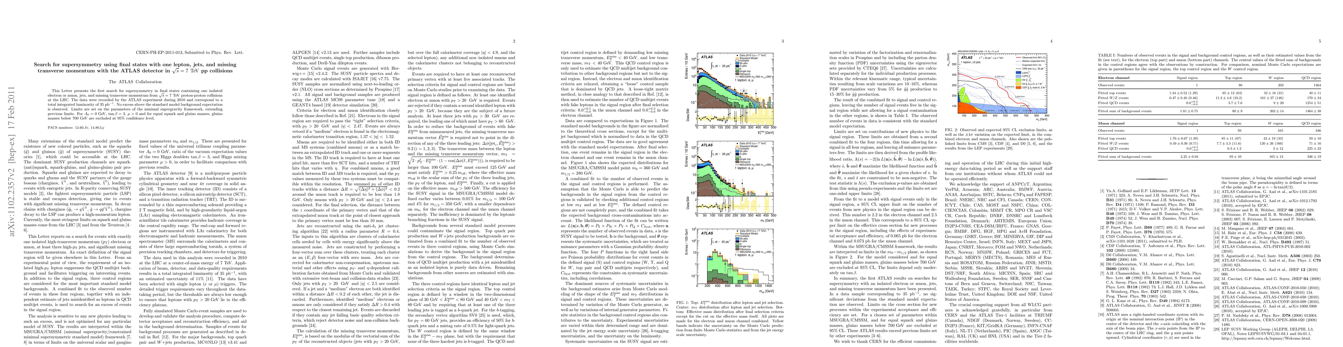 This paper reports the first search for supersymmetry in events with one lepton, jets, and missing transverse momentum using the ATLAS detector at the LHC. No significant excess above standard model predictions was observed, leading to new exclusion limits on gluino masses in the minimal supergravity framework.