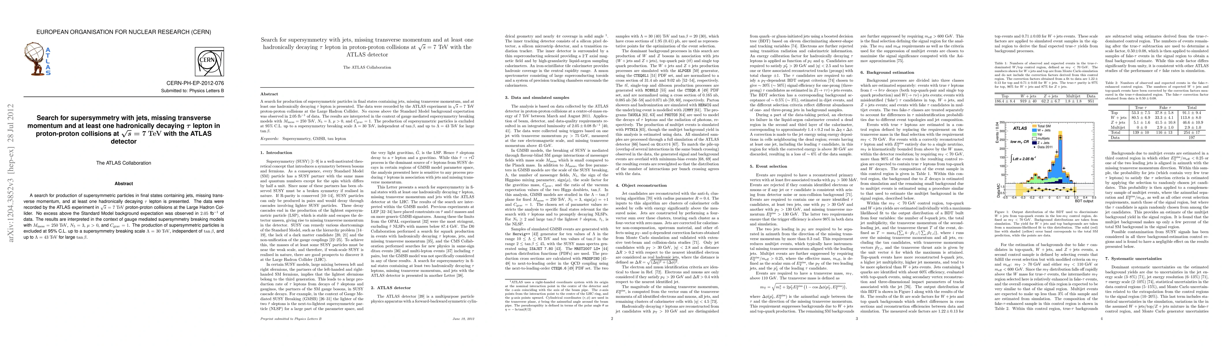 This paper reports a search for supersymmetric particles in ATLAS data from 7 TeV proton-proton collisions at the LHC, focusing on events with jets, missing transverse momentum, and hadronically decaying tau leptons. No significant excess was found, leading to exclusions of supersymmetric production up to specific scales in gauge mediated models.