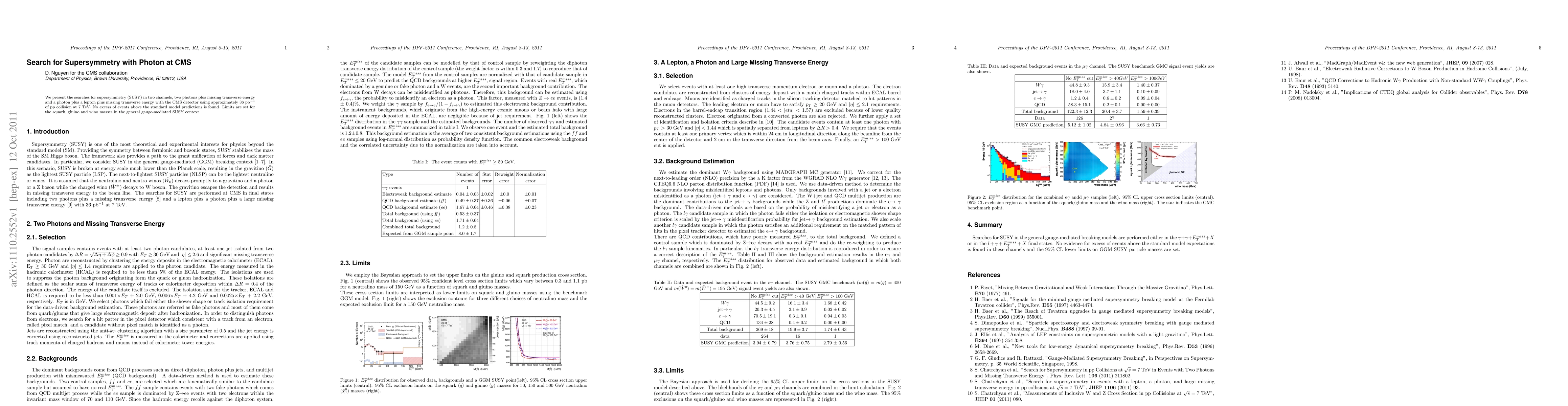 We present the searches for supersymmetry (SUSY) in two channels, two photons plus missing transverse energy and a photon plus a lepton plus missing transverse energy with the CMS detector using approximately 36 $\rm{pb}^{-1}$ of pp collision at 7 TeV. No excess of events above the standard model predictions is found. Limits are set for the squark, gluino and wino masses in the general gauge-mediated SUSY context.