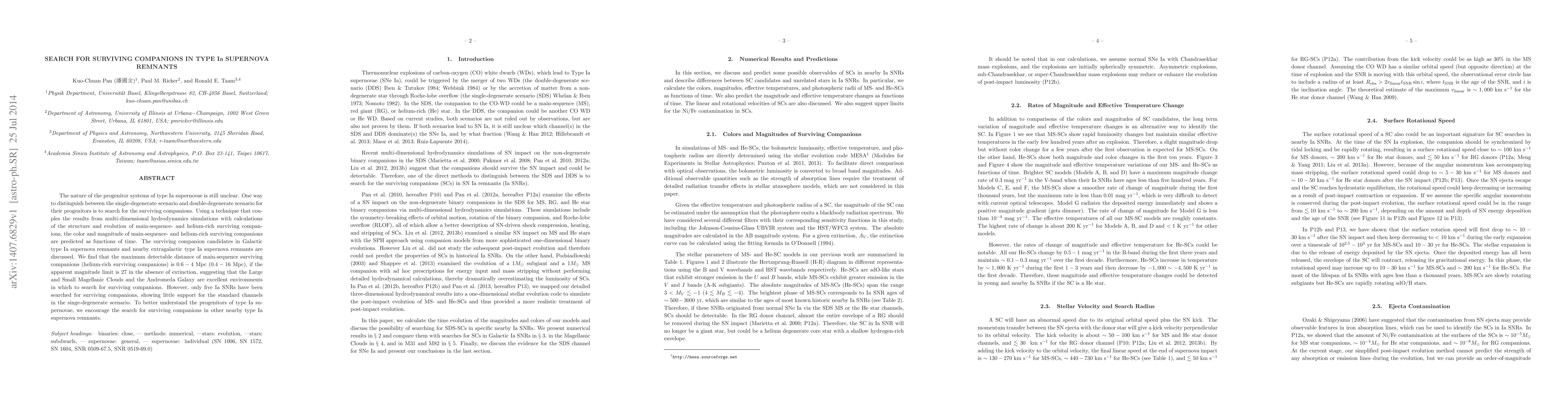 This paper explores the search for surviving companions in type Ia supernova remnants to distinguish between single-degenerate and double-degenerate progenitor scenarios. The study finds that main-sequence and helium-rich companions can be detected up to 4 Mpc and 16 Mpc respectively, suggesting nearby galaxies like the Magellanic Clouds and Andromeda are ideal for such searches.