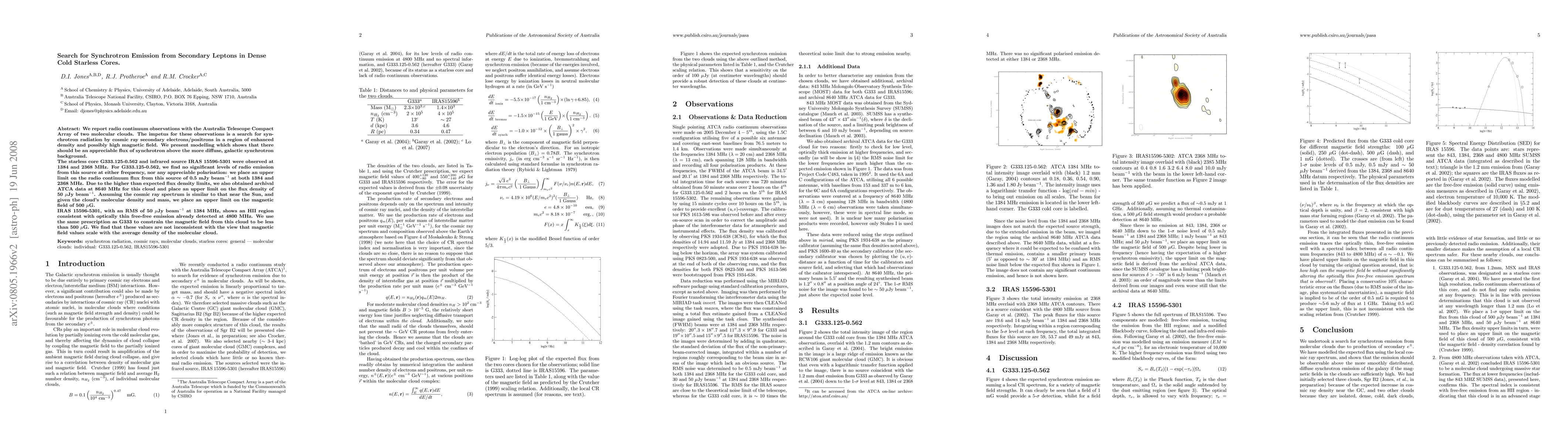 We report radio continuum observations with the Australia Telescope Compact Array of two molecular clouds. The impetus for these observations is a search for synchrotron radiation by cosmic ray secondary electrons/positrons in a region of enhanced density and possibly high magnetic field. We present modelling which shows that there should be an appreciable flux of synchrotron above the more diffuse, galactic synchrotron background. The starless core G333.125-0.562 and infrared source IRAS 15596-5301 were observed at 1384 and 2368 MHz. For G333.125-0.562, we find no significant levels of radio emission from this source at either frequency, nor any appreciable polarisation: we place an upper limit on the radio continuum flux from this source of 0.5 mJy per beam at both 1384 and 2368 MHz. Due to the higher than expected flux density limits, we also obtained archival ATCA data at 8640 MHz for this cloud and place an upper limit on the flux density of 50 micro-Jy per beam. Assuming the cosmic ray spectrum is similar to that near the Sun, and given the cloud's molecular density and mass, we place an upper limit on the magnetic field of 500 micro-G. IRAS 15596-5301, with an RMS of 50 micro-Jy per beam at 1384 MHz, shows an HII region consistent with optically thin free-free emission already detected at 4800 MHz. We use the same prescription as G333 to constrain the magnetic field from this cloud to be less than 500 micro-G. We find that these values are not inconsistent with the view that magnetic field values scale with the average density of the molecular cloud.