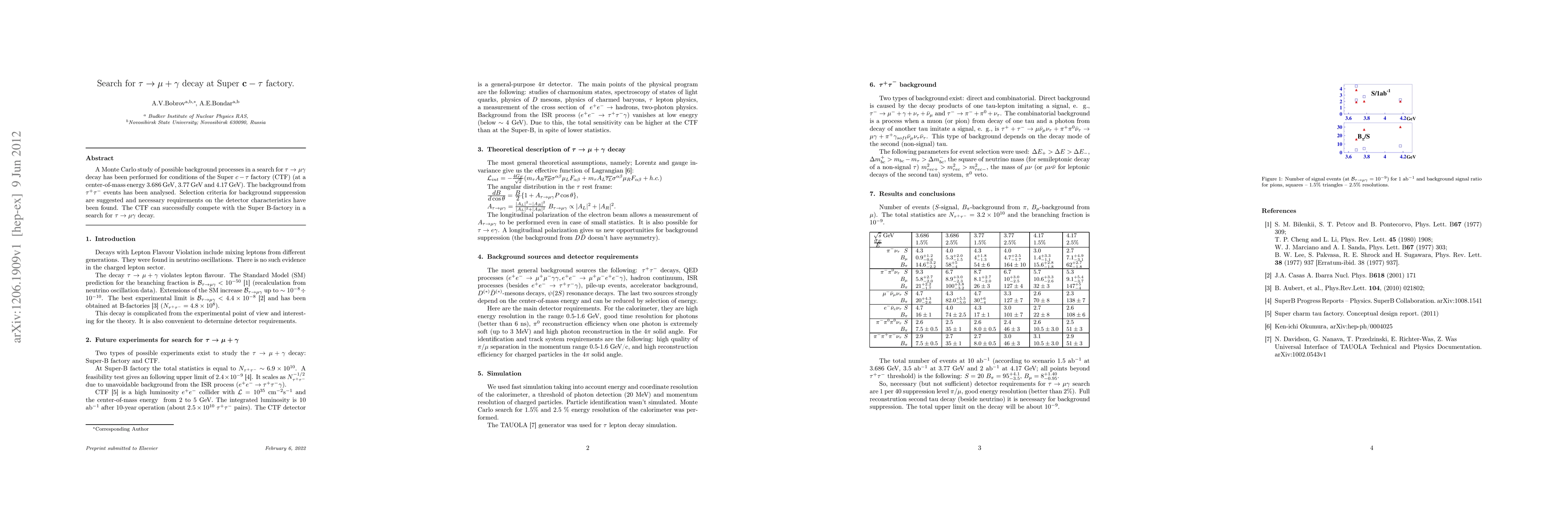 This study investigates background processes for detecting $\tau\to\mu+\gamma$ decay at the Super $c-\tau$ factory, analyzing $\tau^{+}\tau^{-}$ events and suggesting criteria for background suppression. The research concludes that the CTF can effectively compete with the Super B-factory in this decay search.