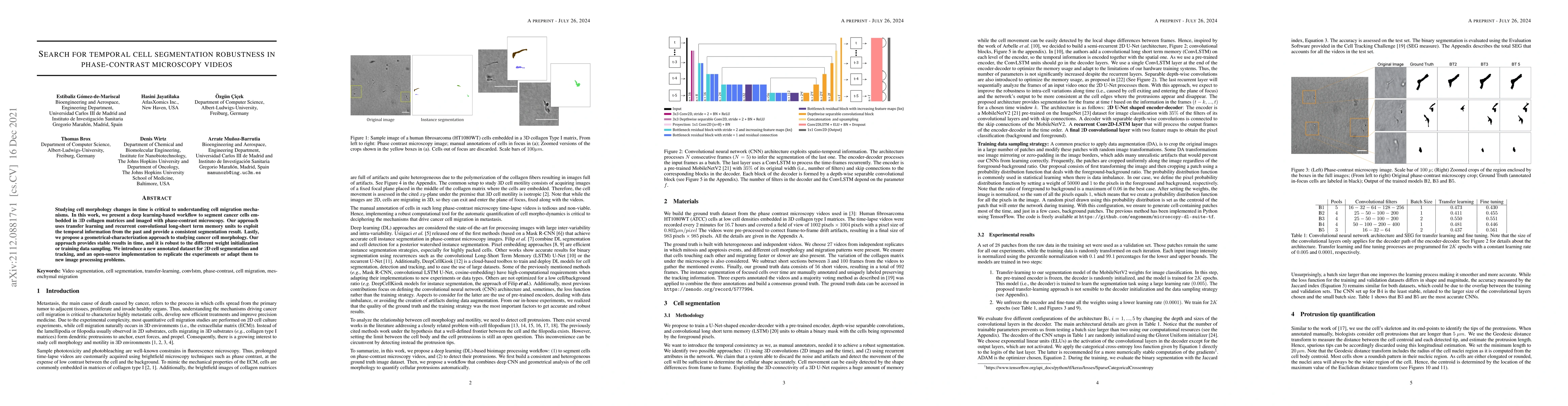 Studying cell morphology changes in time is critical to understanding cell migration mechanisms. In this work, we present a deep learning-based workflow to segment cancer cells embedded in 3D collagen matrices and imaged with phase-contrast microscopy. Our approach uses transfer learning and recurrent convolutional long-short term memory units to exploit the temporal information from the past and provide a consistent segmentation result. Lastly, we propose a geometrical-characterization approach to studying cancer cell morphology. Our approach provides stable results in time, and it is robust to the different weight initialization or training data sampling. We introduce a new annotated dataset for 2D cell segmentation and tracking, and an open-source implementation to replicate the experiments or adapt them to new image processing problems.