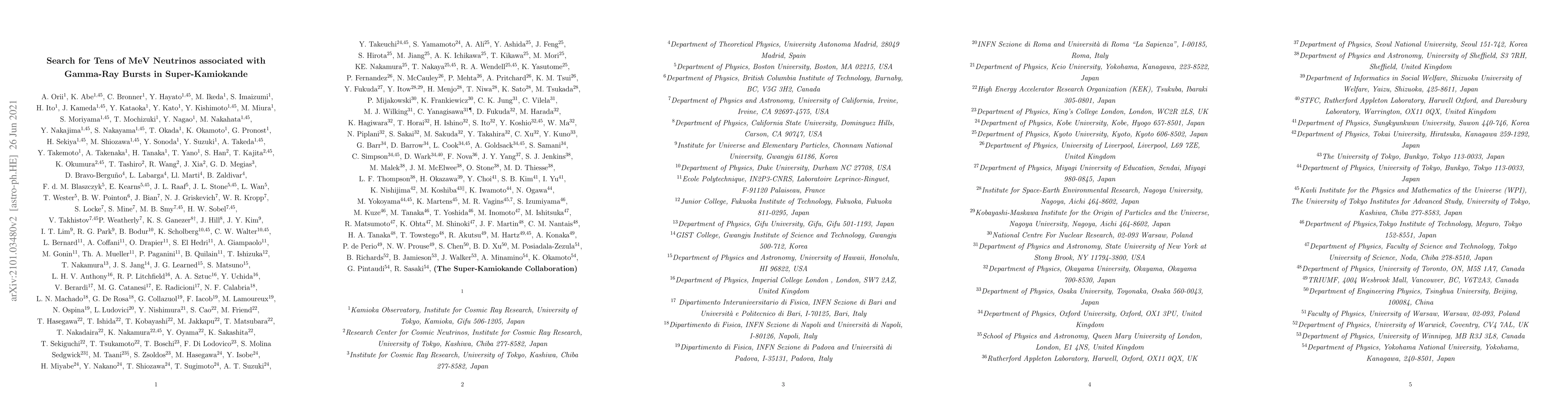 The Super-Kamiokande detector searched for MeV neutrinos coincident with 2208 Gamma-Ray Bursts (GRBs) from 2008 to 2017 but found no significant signal above background. The study set an upper limit on the electron antineutrino fluence for 8 MeV to 100 MeV positrons.