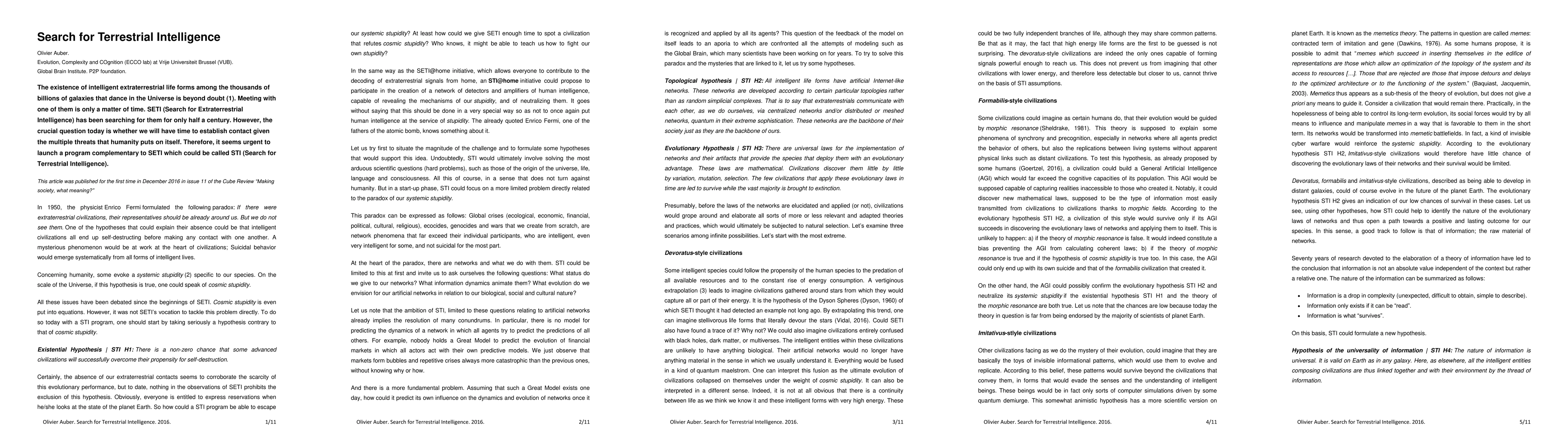 The existence of intelligent extraterrestrial life forms among the thousands of billions of galaxies that dance in the Universe is beyond doubt. Meeting with one of them is only a matter of time. SETI (Search for Extraterrestrial Intelligence) has been searching for them for only half a century. However, the crucial question today is whether we will have time to establish contact given the multiple threats that humanity puts on itself. Therefore, it seems urgent to launch a program complementary to SETI which could be called STI (Search for Terrestrial Intelligence).