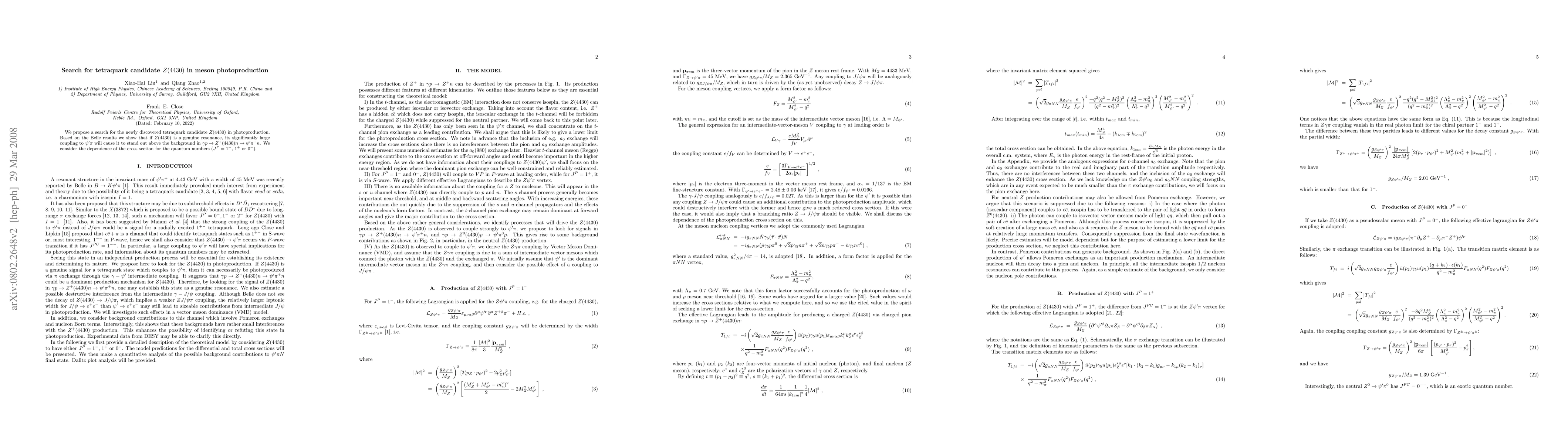 This research proposes a search for the tetraquark candidate Z(4430) in meson photoproduction, utilizing Belle results to predict its large coupling to $\psi^\prime\pi$ and its distinct appearance in the reaction $\gamma p\to Z^+(4430) n\to \psi^\prime \pi^+ n$. The study examines the cross section dependence for different quantum numbers.