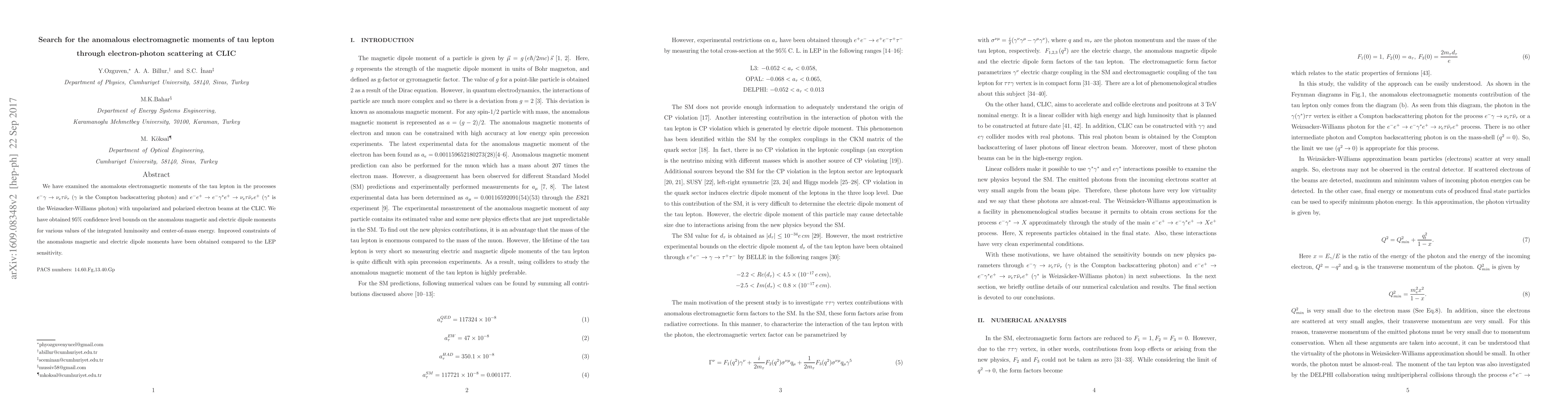 This research investigates the anomalous electromagnetic moments of the tau lepton via electron-photon scattering processes at the CLIC collider, obtaining improved 95% confidence level bounds on the magnetic and electric dipole moments compared to previous LEP results.