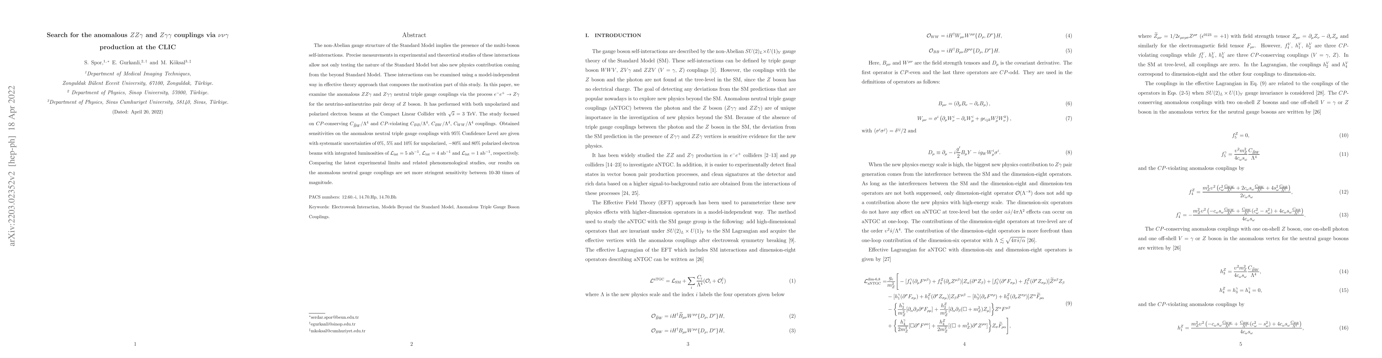 The non-Abelian gauge structure of the Standard Model implies the presence of the multi-boson self-interactions. Precise measurements in experimental and theoretical studies of these interactions allow not only testing the nature of the Standard Model but also new physics contribution coming from the beyond Standard Model. These interactions can be examined using a model-independent way in effective theory approach that composes the motivation part of this study. In this paper, we examine the anomalous $ZZ\gamma$ and $Z\gamma\gamma$ neutral triple gauge couplings via the process $e^{-} e^{+}\to Z\gamma$ for the neutrino-antineutrino pair decay of $Z$ boson. It has performed with both unpolarized and polarized electron beams at the Compact Linear Collider with $\sqrt{s}= 3$ TeV. The study focused on $CP$-conserving $C_{\widetilde{B}W}/{\Lambda^4}$ and $CP$-violating $C_{BB}/{\Lambda^4}$, $C_{BW}/{\Lambda^4}$, $C_{WW}/{\Lambda^4}$ couplings. Obtained sensitivities on the anomalous neutral triple gauge couplings with $95\%$ Confidence Level are given with systematic uncertainties of $0\%$, $5\%$ and $10\%$ for unpolarized, $-80\%$ and $80\%$ polarized electron beams with integrated luminosities of ${\cal L}_{\text{int}}=5$ $\rm ab^{-1}$, ${\cal L}_{\text{int}}=4$ $\rm ab^{-1}$ and ${\cal L}_{\text{int}}=1$ $\rm ab^{-1}$, respectively. Comparing the latest experimental limits and related phenomenological studies, our results on the anomalous neutral gauge couplings are set more stringent sensitivity between 10-30 times of magnitude.