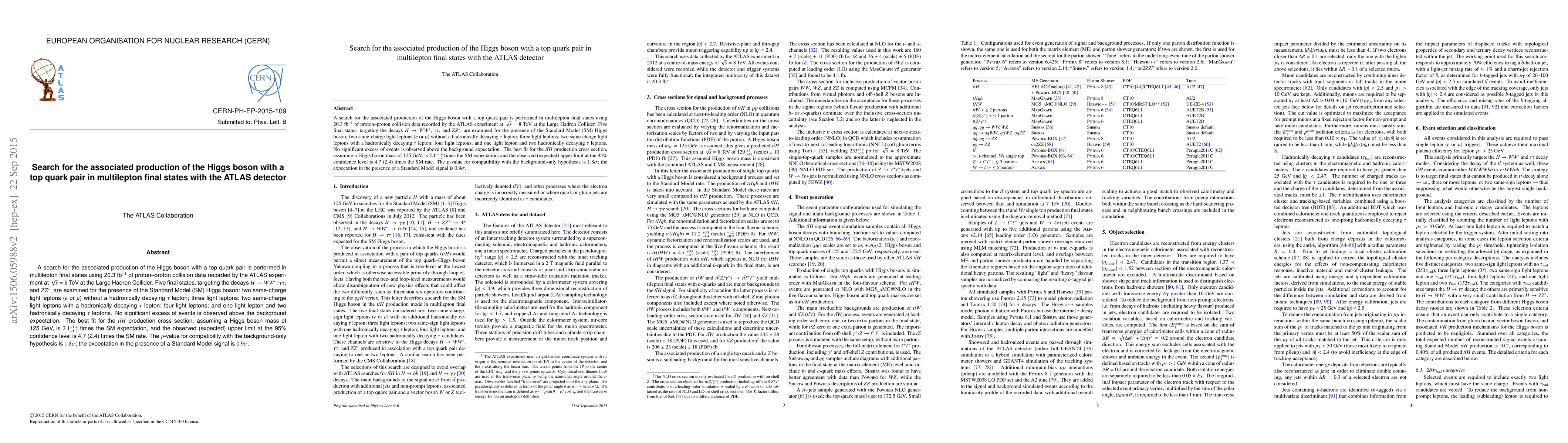 The ATLAS experiment searched for the associated production of the Higgs boson with a top quark pair in multilepton final states using 20.3 fb$^{-1}$ of data at $\sqrt{s}=8$ TeV. No significant excess was observed, resulting in a best fit for the $t\bar t H$ production cross section at 2.1 times the Standard Model expectation, with an observed upper limit at 95% confidence level of 4.7 times the SM rate.