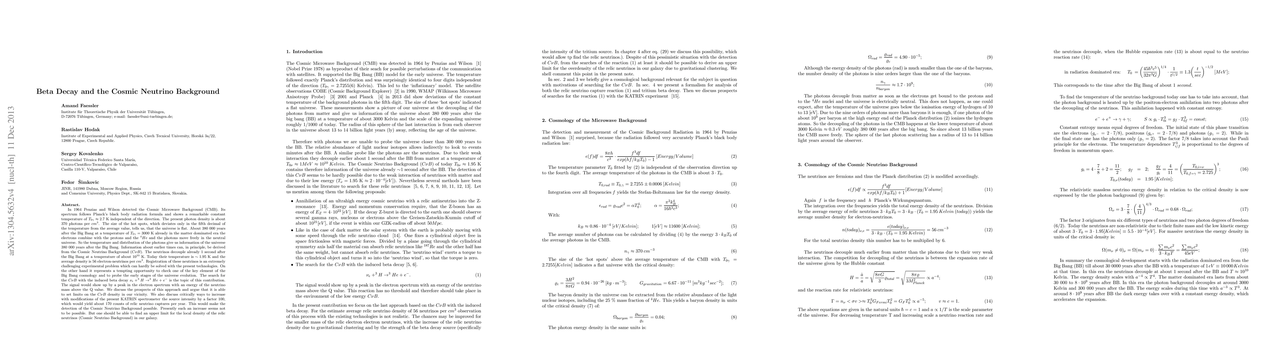 The spectrum of the Cosmic Microwave Background follows Planck's black body radiation formula and shows a remarkable constant temperature of T = 2.7. About 380 000 years after the Big Bang at a temperature of T = 3000 Kelvin in the matter dominated era the electrons combine with the protons and 4He and the photons move freely in the neutral universe. So the temperature and distribution of the photons give us information of the universe 380 000 years after the Big Bang. Information about earlier times can, in principle, be derived from the Cosmic Neutrino Background (relic neutrinos). The neutrinos decouple already about 1 second after the Big Bang at a temperature of around 1 MeV or 10^{10} Kelvin. Today their temperature is about 1.95 Kelvin. Registration of these neutrinos is an extremely challenging experimental problem, which can hardly be solved with the present technologies. On the other hand it represents a tempting opportunity to check one of key elements of the Big Bang Cosmology and to probe the early stages of the universe evolution. The search for the Cosmic Neutrino Background with the induced beta decay: relic neutrino + 3H --> 3He + e-, is the topic of this contribution. The signal would show up as a peak in the electron spectrum by an energy with the neutrino mass above the Q value. We discuss the prospects of this approach and argue that it is able to set limits on the Cosmic Neutrino density in our vicinity. We also discuss critically ways to increase with modifications of the present KATRIN spectrometer the Tritium source intensity by a factor 100, which would yield about 170 counts of relic neutrino captures per year. Presently such an increase of the Tritium source intensity seems not to be possible. But one should be able to find an upper limit for the local density of the relic neutrinos in our galaxy.