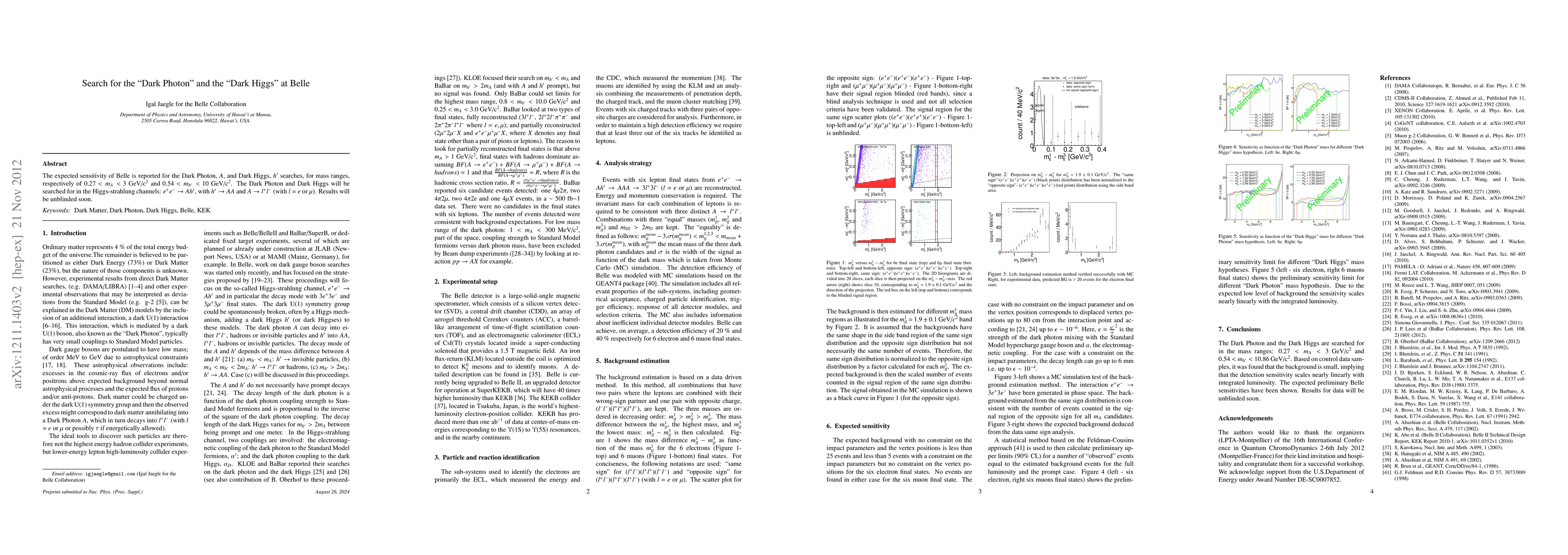 The Belle experiment reports its expected sensitivity for detecting Dark Photons (A) and Dark Higgses (h') within specified mass ranges, utilizing Higgs-strahlung channels e^+e^- -> Ah', with h' -> AA and A -> l^+l^- (l = e or μ). Results are anticipated to be unblinded soon.