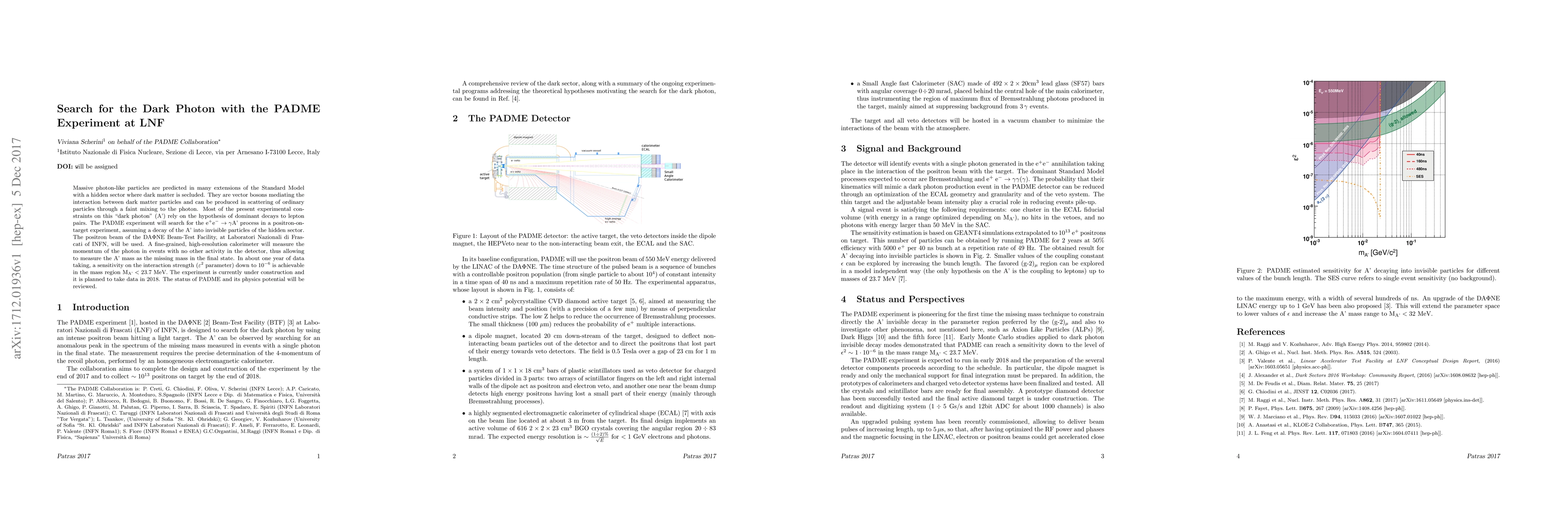 The PADME experiment aims to search for dark photons (A') in positron-electron scattering at LNF, focusing on their potential decay into hidden sector particles. The experiment plans to detect the A' by measuring the missing mass in events with no other detectable activity, achieving sensitivity to interaction strengths down to $10^{-6}$ in the mass region below 23.7 MeV.