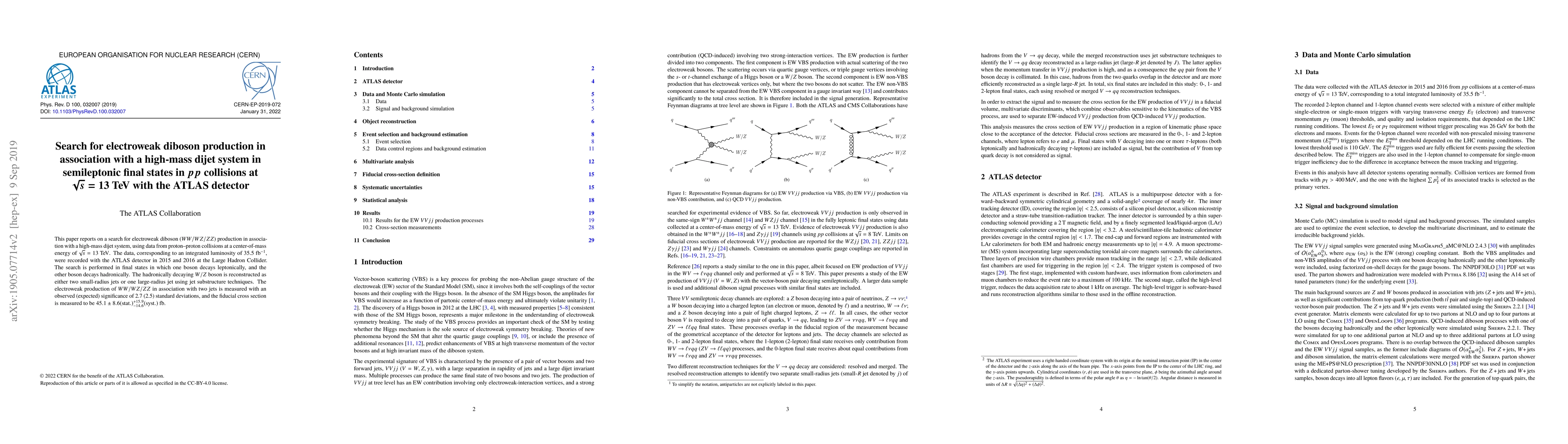 This paper investigates electroweak diboson production ($WW/WZ/ZZ$) in association with a high-mass dijet system in semileptonic final states using ATLAS data from $pp$ collisions at $\sqrt{s}=13$ TeV. The analysis yields a 2.7 standard deviation observed significance with a measured fiducial cross section of $45.1 \pm 8.6(\mathrm{stat.}) ^{+15.9} _{-14.6} (\mathrm{syst.})$ fb.