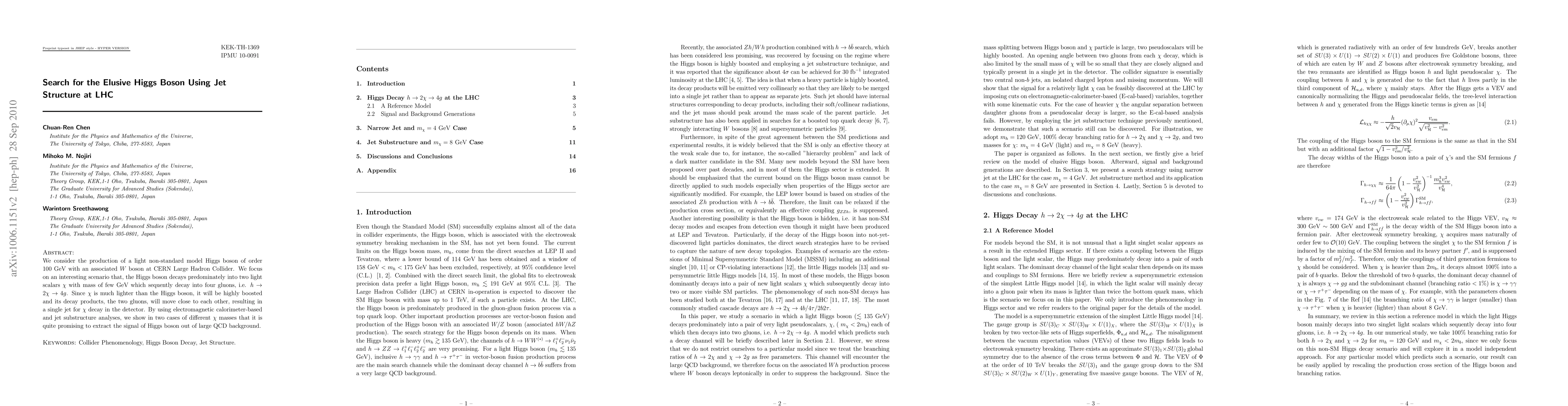 We consider the production of a light non-standard model Higgs boson of order $100~\GEV$ with an associated $W$ boson at CERN Large Hadron Collider. We focus on an interesting scenario that, the Higgs boson decays predominately into two light scalars $\chi$ with mass of few GeV which sequently decay into four gluons, i.e. $h\to 2\chi \to 4g$. Since $\chi$ is much lighter than the Higgs boson, it will be highly boosted and its decay products, the two gluons, will move close to each other, resulting in a single jet for $\chi$ decay in the detector. By using electromagnetic calorimeter-based and jet substructure analyses, we show in two cases of different $\chi$ masses that it is quite promising to extract the signal of Higgs boson out of large QCD background.