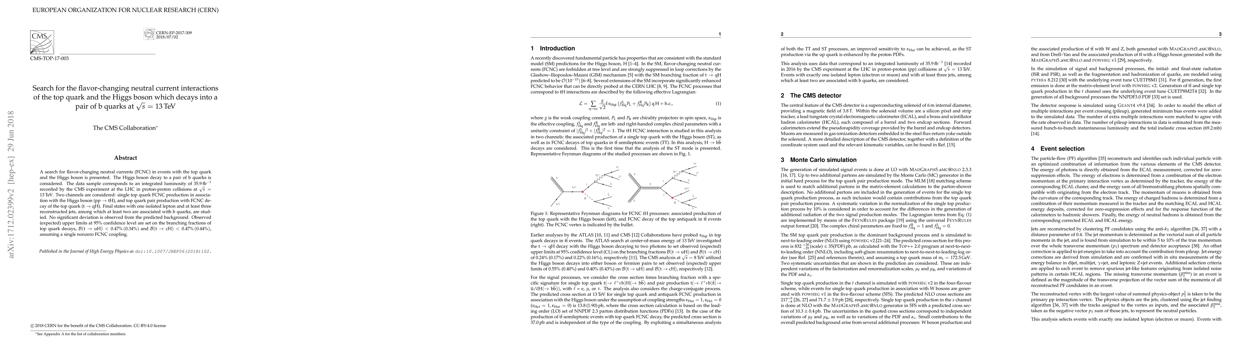This paper presents a search for flavor-changing neutral current interactions in top quark and Higgs boson events at the LHC, focusing on Higgs decay to b quarks. No significant deviations from background predictions were observed, setting upper limits on the branching fractions of top quark decays to other quarks.