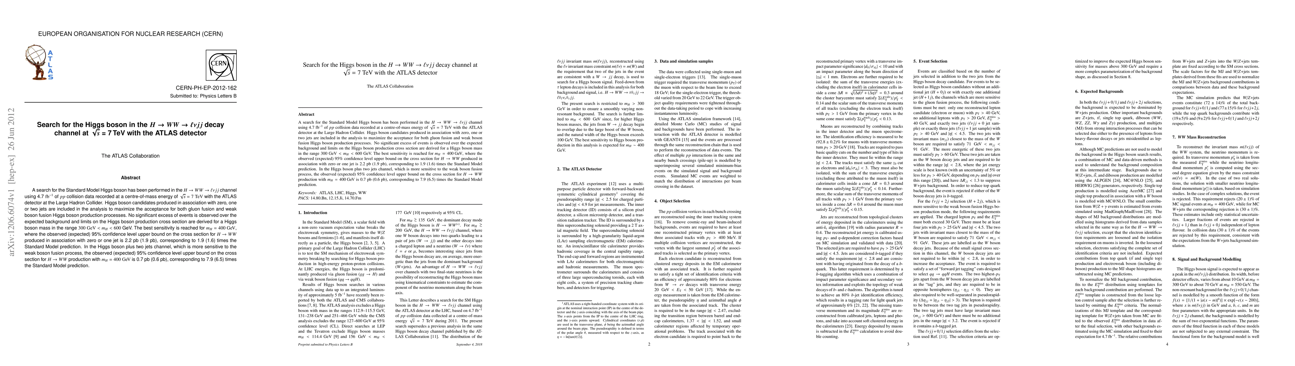 This paper reports a search for the Higgs boson in the H->WW->lnujj decay channel using 4.7 fb^-1 of data from the ATLAS detector at 7 TeV LHC. No significant excess over background is observed, and upper limits on the cross section are derived for Higgs masses between 300 and 600 GeV, with the best sensitivity at 400 GeV.
