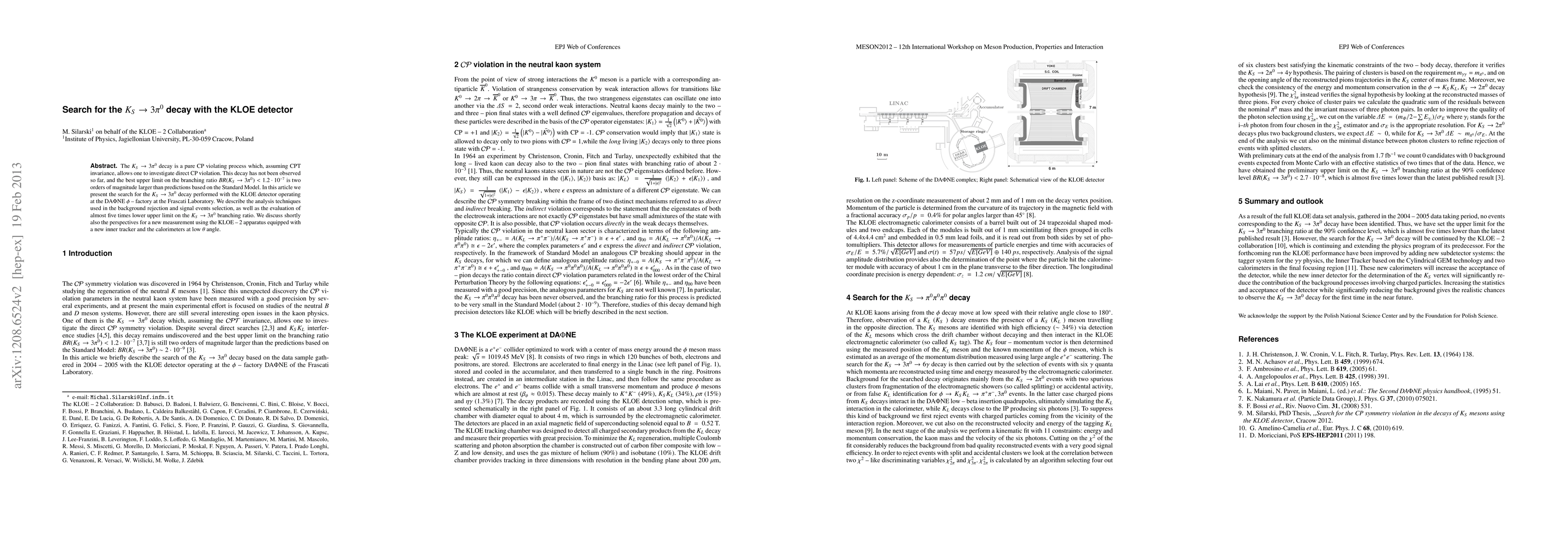 The $K_S \to 3 \pi^0$ decay is a pure CP violating process which, assuming CPT invariance, allows one to investigate direct CP violation. This decay has not been observed so far, and the best upper limit on the branching ratio $BR(K_S to 3\pi^0) < 1.2 \cdot 10^{-7}$ is two orders of magnitude larger than predictions based on the Standard Model: $BR(K_S \to 3\pi^0) \sim 2 \cdot 10^{-9}$. In this article we present the search for the $K_S \to 3\pi^0$ decay performed with the KLOE detector operating at the DAFNE {\Phi}-factory at the Frascati Laboratory. We describe the analysis techniques used in the background rejection and signal events selection as well as the evaluation of almost five times lower upper limit on the $K_S \to 3\pi^0$ branching ratio. We discuss shortly also the perspectives for a new measurement using the KLOE-2 apparatus equipped with a new inner tracker and the calorimeters at low theta angle.