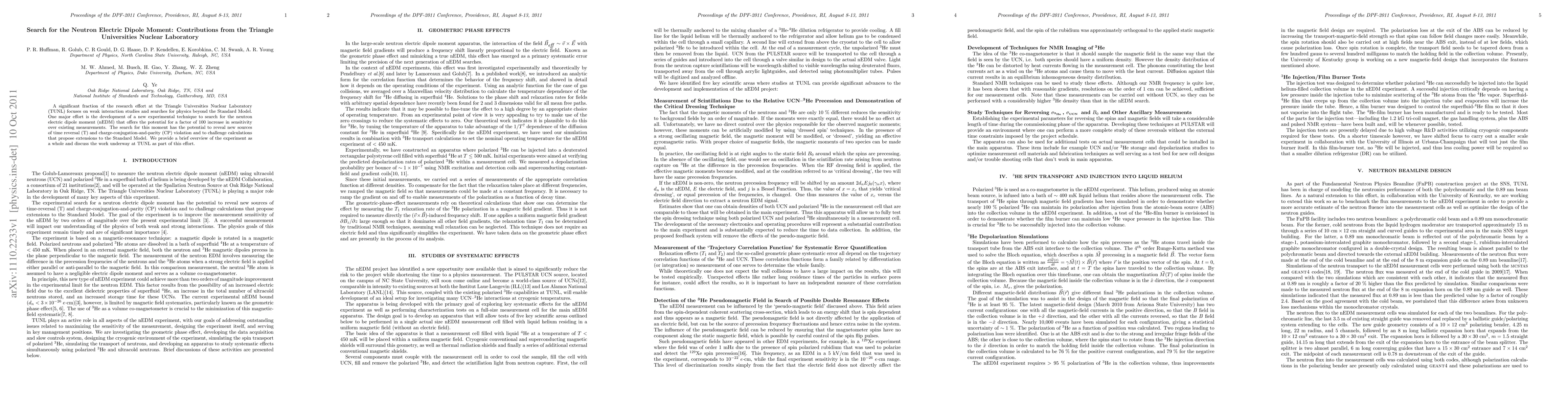 A significant fraction of the research effort at the Triangle Universities Nuclear Laboratory (TUNL) focuses on weak interaction studies and searches for physics beyond the Standard Model. One major effort is the development of a new experimental technique to search for the neutron electric dipole moment (nEDM) that offers the potential for a factor of 100 increase in sensitivity over existing measurements. The search for this moment has the potential to reveal new sources of time reversal (T) and charge-conjugation-and-parity (CP) violation and to challenge calculations that propose extensions to the Standard Model. We provide a brief overview of the experiment as a whole and discuss the work underway at TUNL as part of this effort.