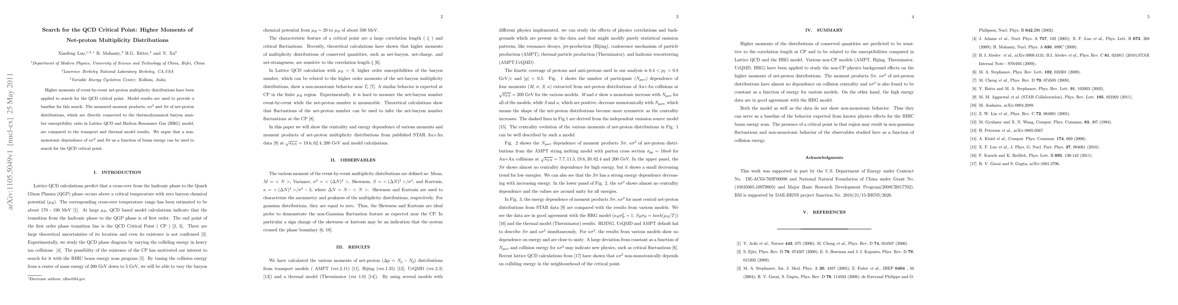 This paper investigates the QCD critical point using higher moments of net-proton multiplicity distributions, comparing measured moment products $\kappa\sigma^2$ and $S\sigma$ to model baselines. The study suggests a non-monotonic dependence of these moments with beam energy as a potential indicator of the QCD critical point.