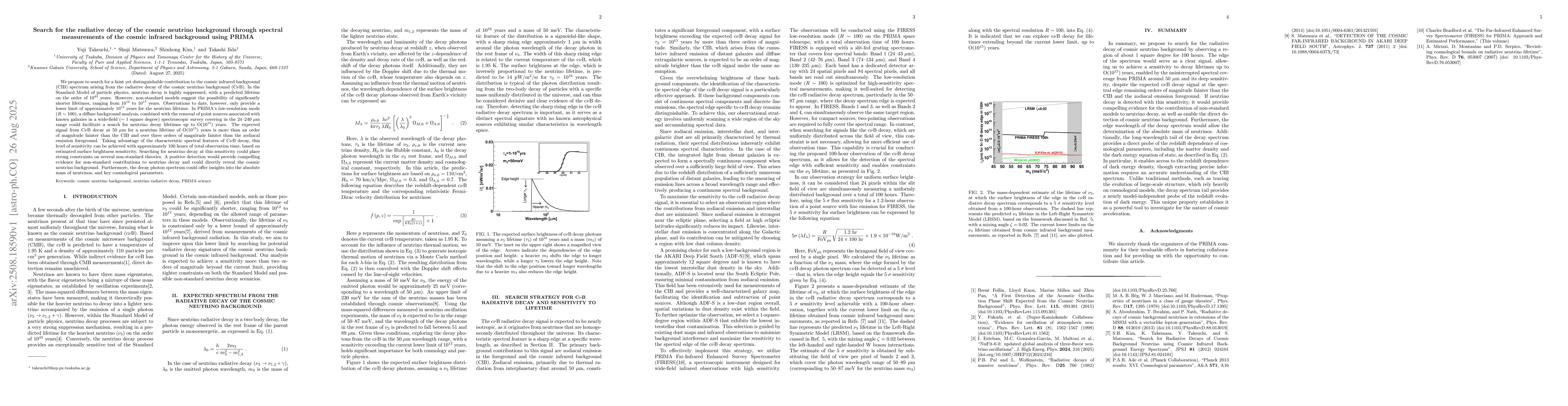 We propose to search for a faint yet distinguishable contribution to the cosmic infrared background (CIB) spectrum arising from the radiative decay of the cosmic neutrino background (C$\nu$B). In the Standard Model of particle physics, neutrino decay is highly suppressed, with a predicted lifetime on the order of $10^{43}$ years. However, non-standard models suggest the possibility of significantly shorter lifetimes, ranging from $10^{12}$ to $10^{17}$ years. Observations to date, however, only provide a lower limit of approximately $10^{12}$ years for the neutrino lifetime. In PRIMA's low-resolution mode ($R \sim 100$), a diffuse background analysis, combined with the removal of point sources associated with known galaxies in a wide-field ($\sim 1$ square degree) spectroscopic survey covering in the 24-240 $\mu$m range could facilitate a search for neutrino decay lifetimes up to $O(10^{15})$ years. The expected signal from C$\nu$B decay at 50 $\mu$m for a neutrino lifetime of $O(10^{15})$ years is more than an order of magnitude fainter than the CIB and over three orders of magnitude fainter than the zodiacal emission foreground. Taking advantage of the characteristic spectral features of C$\nu$B decay, this level of sensitivity can be achieved with approximately 100 hours of total observation time, based on estimated surface brightness sensitivity. Searching for neutrino decay at this sensitivity could place strong constraints on several non-standard theories. A positive detection would provide compelling evidence for non-standard contributions to neutrino decay and could directly reveal the cosmic neutrino background. Furthermore, the decay photon spectrum could offer insights into the absolute mass of neutrinos, and key cosmological parameters.