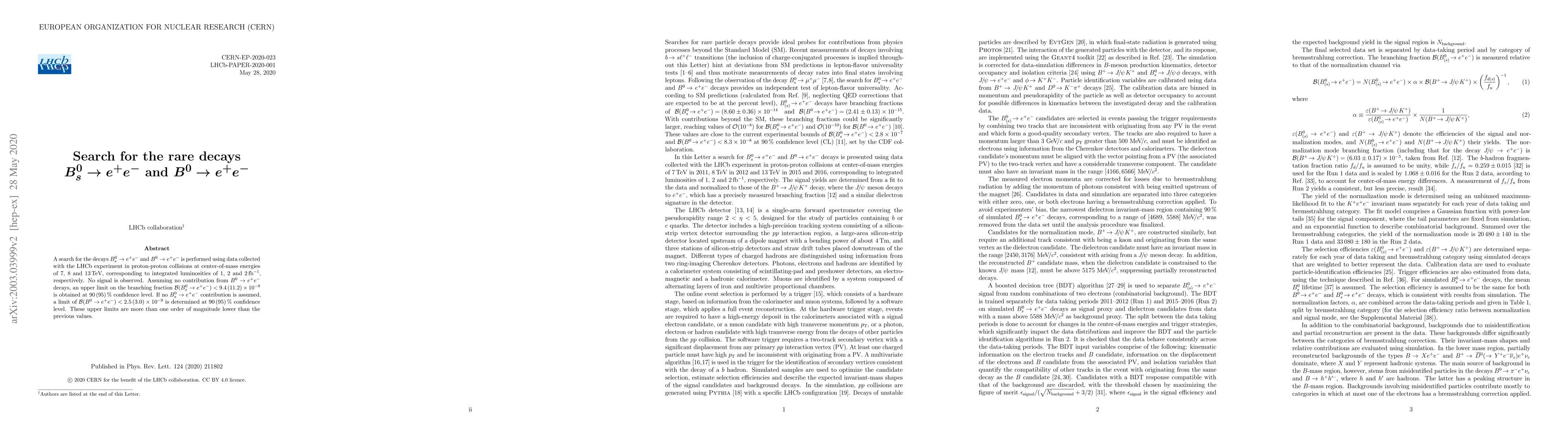 Researchers at LHCb experiment found no evidence of rare decays $B^0_s o e^+e^-$ and $B^0 o e^+e^-$, setting new upper limits at 9.4x10^-9 and 2.5x10^-9 for the first decay.