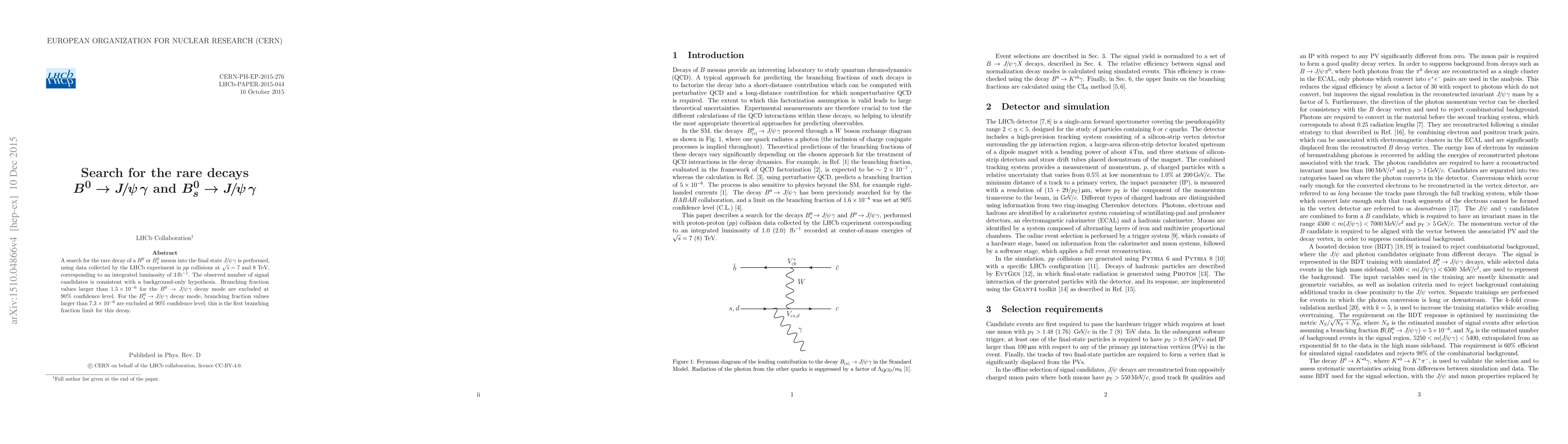 This paper reports a search for rare decays of $B^{0}$ and $B^{0}_{s}$ mesons into $J/\psi\gamma$ using LHCb data at 7 and 8 TeV. No significant signal is observed, leading to exclusion of branching fractions above $1.7\times 10^{-6}$ for $B^{0}\to J/\psi\gamma$ and $7.4\times 10^{-6}$ for $B^{0}_{s}\to J/\psi\gamma$ at 90% confidence level.