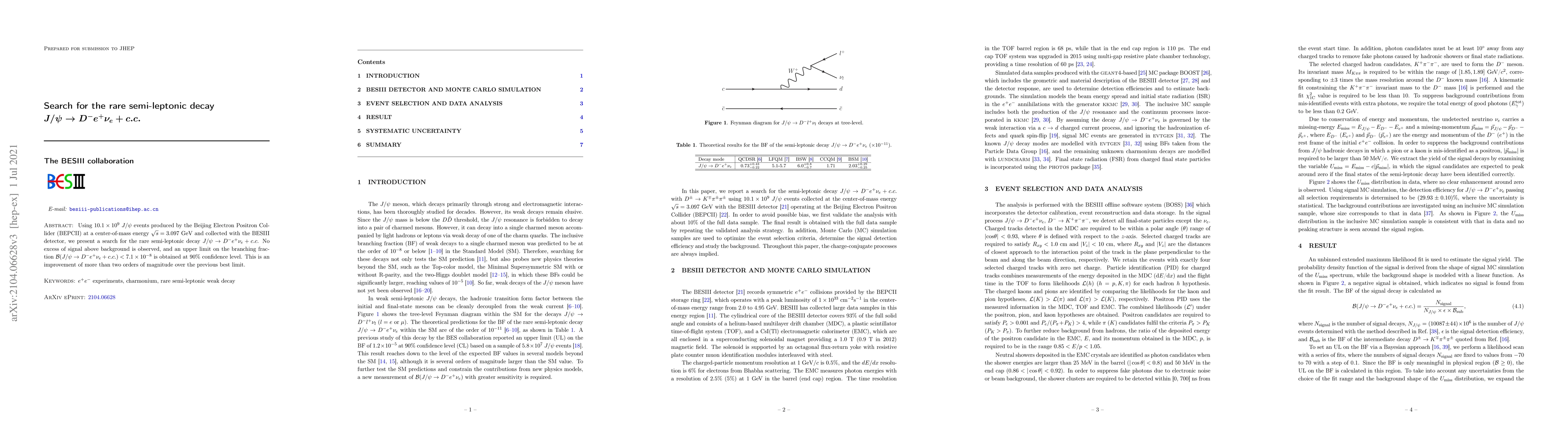 The BESIII experiment searched for the rare semi-leptonic decay $J/\psi\to D^{-}e^{+}\nu_{e}+c.c.$ using $10.1\times10^{9}$ $J/\psi$ events. No signal was observed, setting an upper limit of $\mathcal{B}<7.1\times10^{-8}$ at $90\%$ confidence level, improving previous limits by over two orders of magnitude.