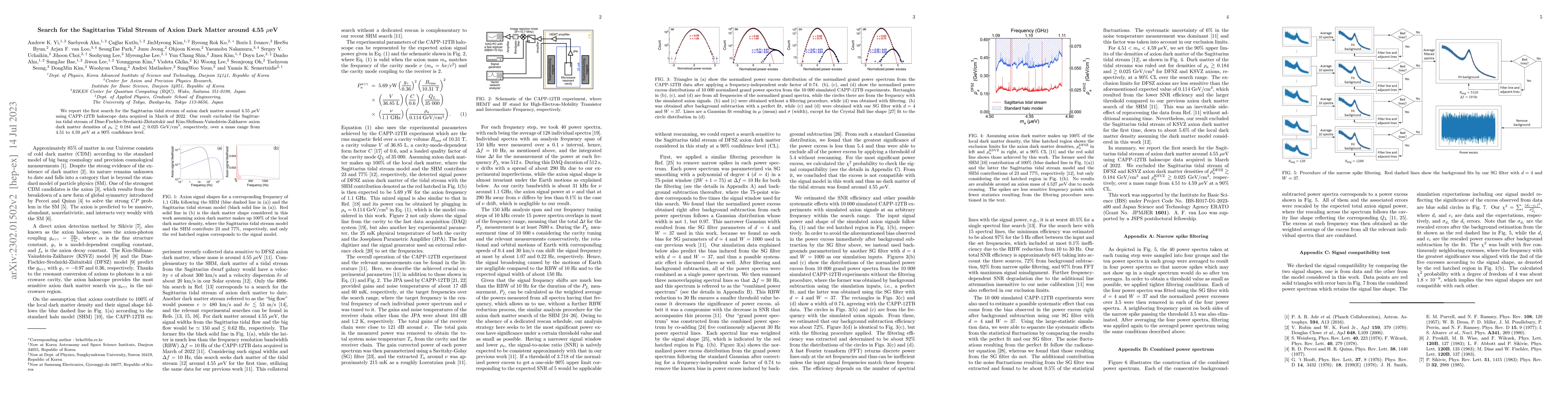 We report the first search for the Sagittarius tidal stream of axion dark matter around 4.55 $\mu$eV using CAPP-12TB haloscope data acquired in March of 2022. Our result excluded the Sagittarius tidal stream of Dine-Fischler-Srednicki-Zhitnitskii and Kim-Shifman-Vainshtein-Zakharov axion dark matter densities of $\rho_a\gtrsim0.184$ and $\gtrsim0.025$ GeV/cm$^{3}$, respectively, over a mass range from 4.51 to 4.59 $\mu$eV at a 90% confidence level.