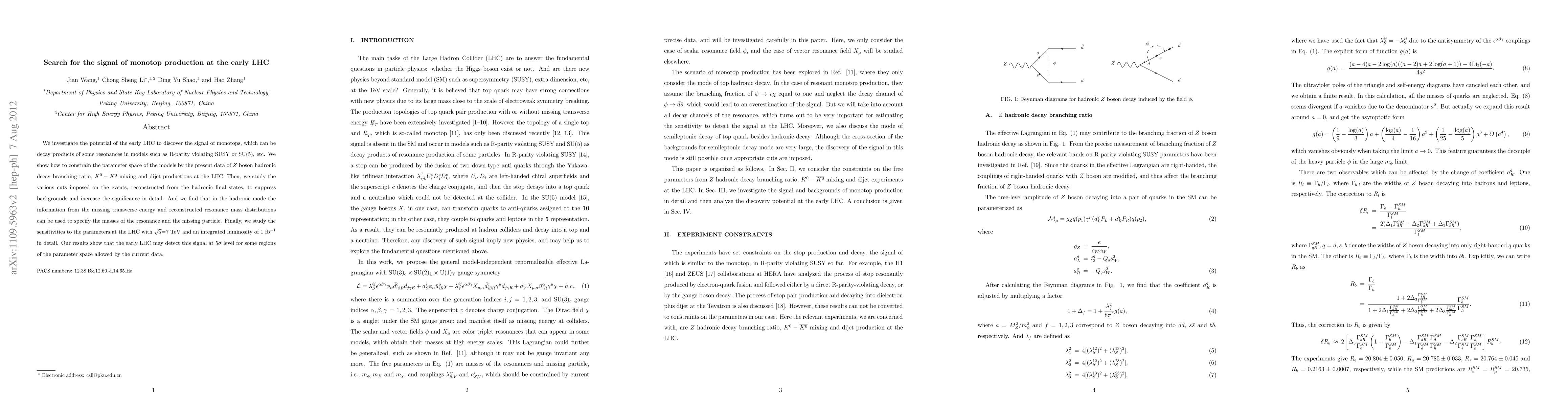 We investigate the potential of the early LHC to discover the signal of monotops, which can be decay products of some resonances in models such as R-parity violating SUSY or SU(5), etc. We show how to constrain the parameter space of the models by the present data of $Z$ boson hadronic decay branching ratio, $K^0-\bar{K^0}$ mixing and dijet productions at the LHC. Then, we study the various cuts imposed on the events, reconstructed from the hadronic final states, to suppress backgrounds and increase the significance in detail. And we find that in the hadronic mode the information from the missing transverse energy and reconstructed resonance mass distributions can be used to specify the masses of the resonance and the missing particle. Finally, we study the sensitivities to the parameters at the LHC with $\sqrt{s}$=7 TeV and an integrated luminosity of $1 {\rm fb}^{-1}$ in detail. Our results show that the early LHC may detect this signal at 5$\sigma$ level for some regions of the parameter space allowed by the current data.
