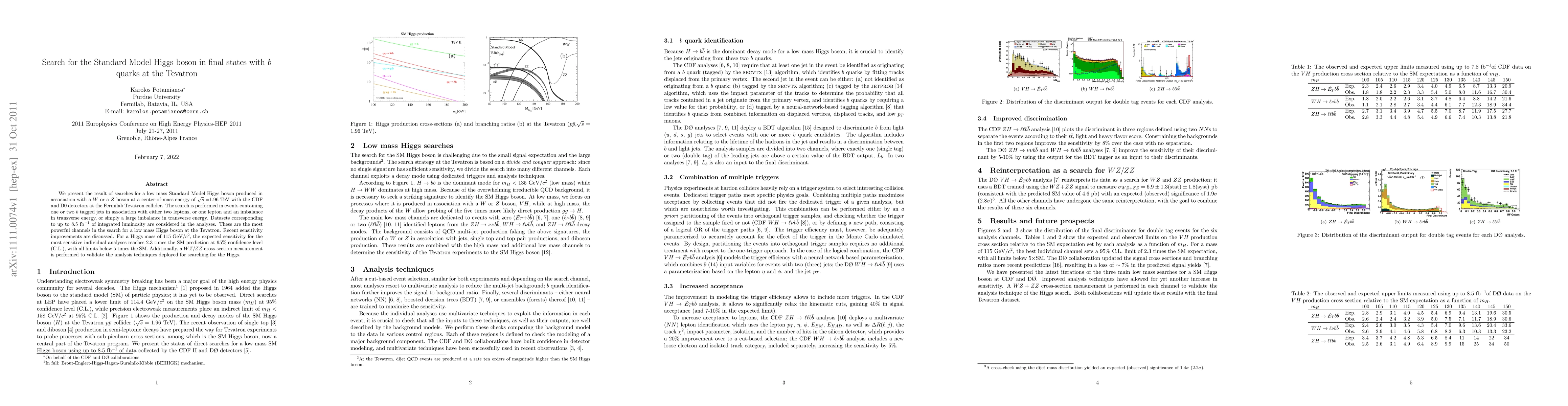 We present the result of searches for a low mass Standard Model Higgs boson produced in association with a $W$ or a $Z$ boson at a center-of-mass energy of $\sqrt{s}=$1.96 TeV with the CDF and D0 detectors at the Fermilab Tevatron collider. The search is performed in events containing one or two $b$ tagged jets in association with either two leptons, or one lepton and an imbalance in transverse energy, or simply a large imbalance in transverse energy. Datasets corresponding to up to 8.5 fb$^{-1}$ of integrated luminosity are considered in the analyses. These are the most powerful channels in the search for a low mass Higgs boson at the Tevatron. Recent sensitivity improvements are discussed. For a Higgs mass of 115 \gevcc, the expected sensitivity for the most sensitive individual analyses reaches 2.3 times the SM prediction at 95% confidence level (C.L.), with all limits below 5 times the SM. Additionally, a $WZ/ZZ$ cross-section measurement is performed to validate the analysis techniques deployed for searching for the Higgs.