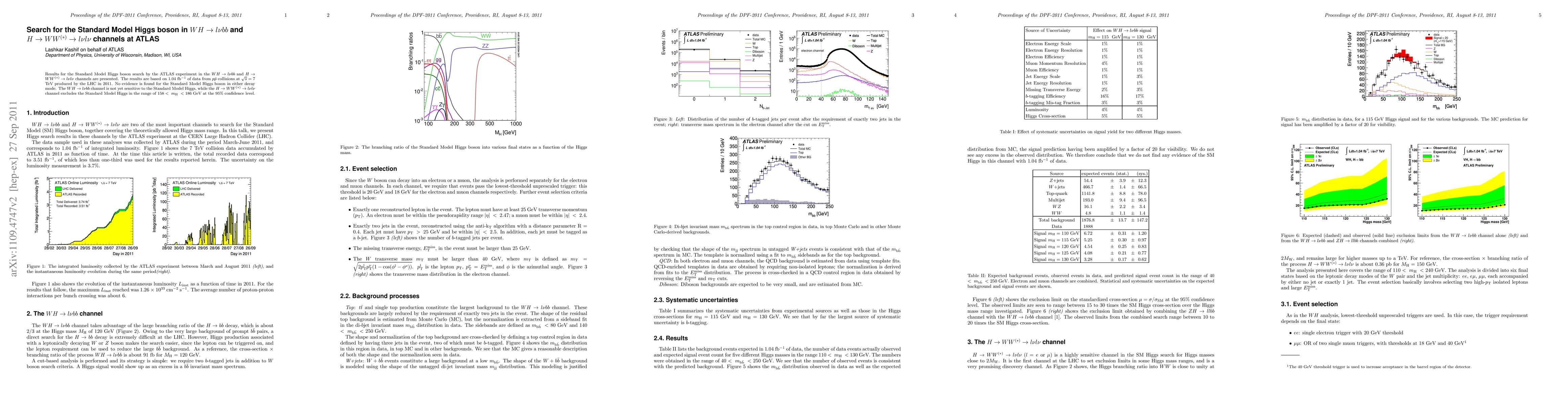 Results for the Standard Model Higgs boson search by the ATLAS experiment in the WH -> lnubb and H -> WW(*) -> lnulnu channels are presented. The results are based on 1.04 fb^-1 of data from pp collisions at sqrt(s) = 7 TeV produced by the LHC in 2011. No evidence is found for the Standard Model Higgs boson in either decay mode. The WH -> lnubb channel is not yet sensitive to the Standard Model Higgs, while the H -> WW(*) -> lnulnu channel excludes the Standard Model Higgs in the range of 158 < m_H < 186 GeV at the 95% confidence level.