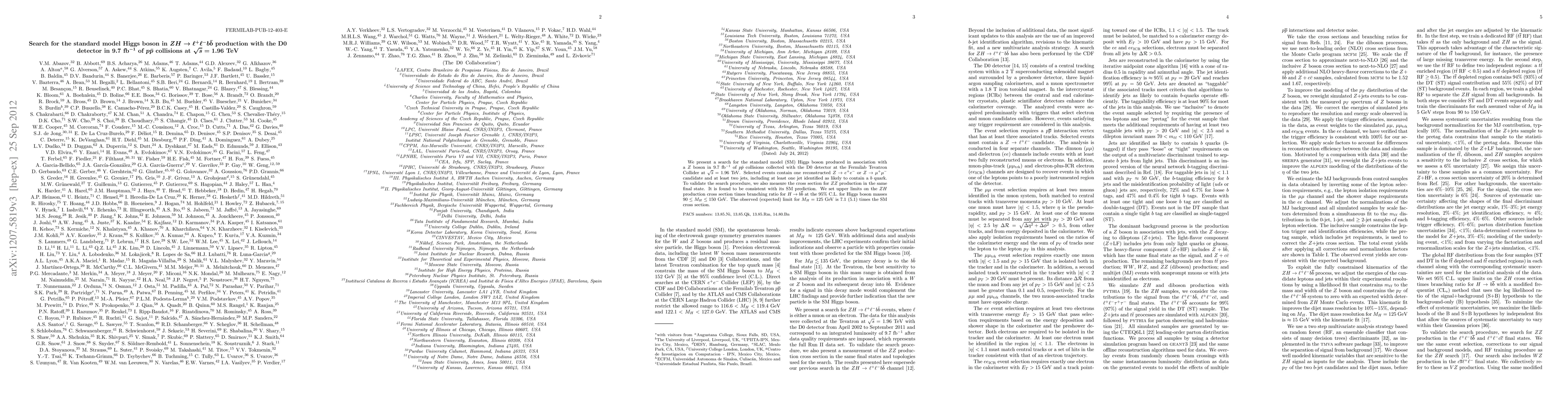 This paper reports a search for the standard model Higgs boson produced in association with a Z boson using the D0 detector at the Tevatron Collider. The analysis sets upper limits on the ZH production cross section for Higgs bosons in the mass range 90 < M_H < 150 GeV, with the observed limit for M_H = 125 GeV being 7.1 times the SM cross section.