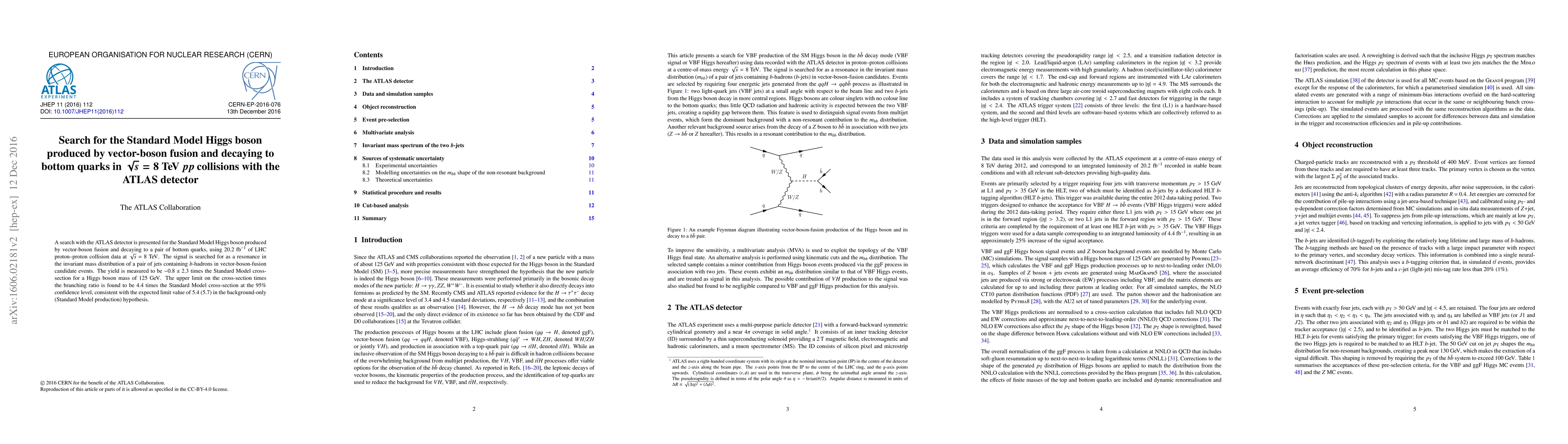 The ATLAS detector searched for Higgs boson production via vector-boson fusion decaying to bottom quarks in 8 TeV collisions and found no significant signal, setting an upper limit on the cross-section times branching ratio at 95% confidence.