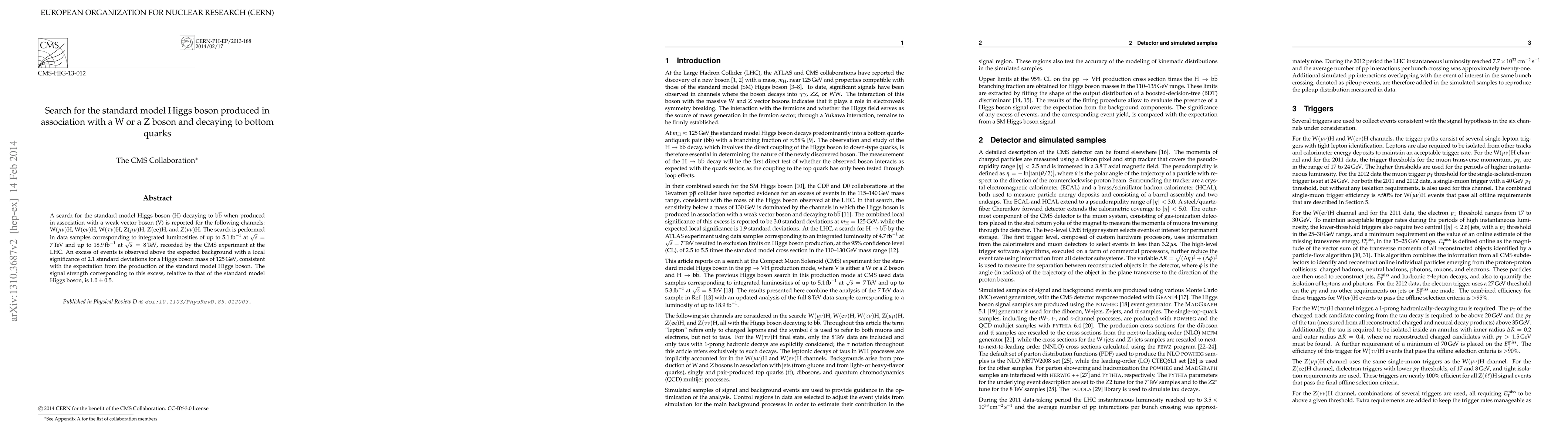 Researchers at CMS report a search for Higgs boson decaying to bottom quarks associated with W or Z bosons, finding an excess of events consistent with the standard model, with a signal strength of 1.0 +/- 0.5.