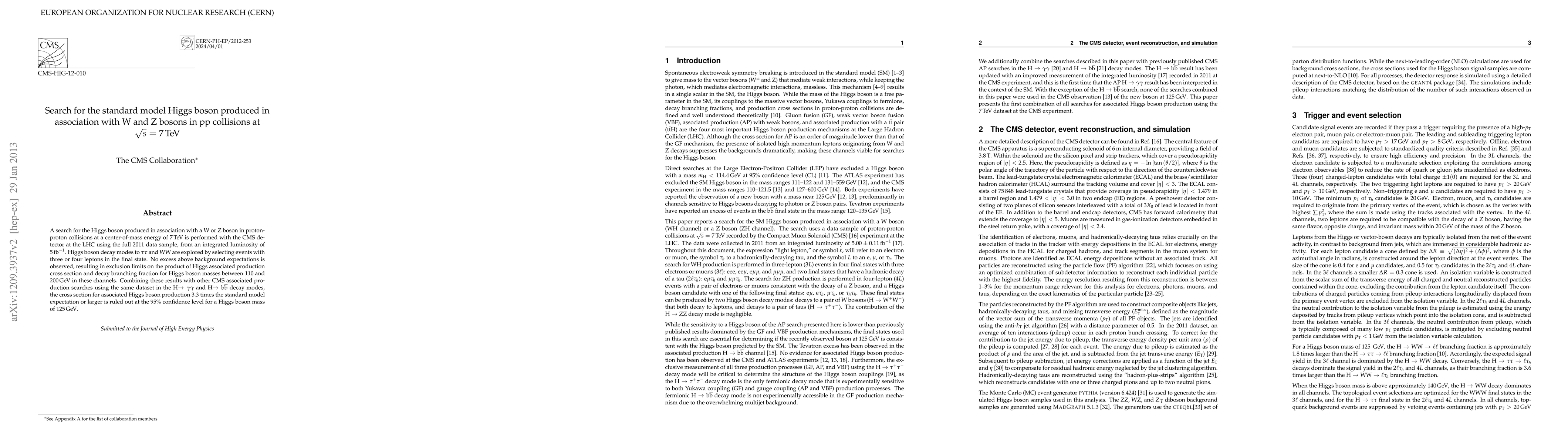 A search for Higgs boson production in association with W and Z bosons found no excess above background expectations, resulting in exclusion limits on Higgs boson masses between 110-200 GeV.