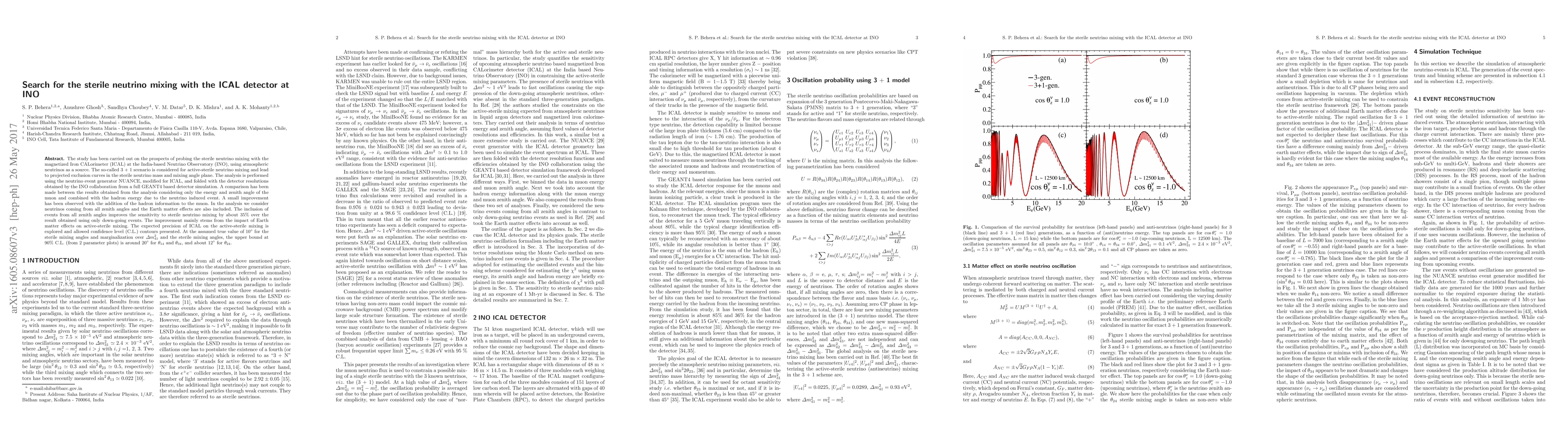 The study has been carried out on the prospects of probing the sterile neutrino mixing with the magnetized Iron CALorimeter (ICAL) at the India-based Neutrino Observatory (INO), using atmospheric neutrinos as a source. The so-called 3~$+$~1 scenario is considered for active-sterile neutrino mixing and lead to projected exclusion curves in the sterile neutrino mass and mixing angle plane. The analysis is performed using the neutrino event generator NUANCE, modified for ICAL, and folded with the detector resolutions obtained by the INO collaboration from a full GEANT4 based detector simulation. A comparison has been made between the results obtained from the analysis considering only the energy and zenith angle of the muon and combined with the hadron energy due to the neutrino induced event. A small improvement has been observed with the addition of the hadron information to the muon. In the analysis we consider neutrinos coming from all zenith angles and the Earth matter effects are also included. The inclusion of events from all zenith angles improves the sensitivity to sterile neutrino mixing by about 35$\%$ over the result obtained using only down-going events. The improvement mainly stems from the impact of Earth matter effects on active-sterile mixing. The expected precision of ICAL on the active-sterile mixing is explored and allowed confidence level (C.L.) contours presented. At the assumed true value of $10^\circ$ for the sterile mixing angles and marginalization over $\Delta m^2_{41}$ and the sterile mixing angles, the upper bound at 90\% C.L. (from 2 parameter plots) is around $20^\circ$ for $\theta_{14}$ and $\theta_{34}$, and about $12^\circ$ for $\theta_{24}$.