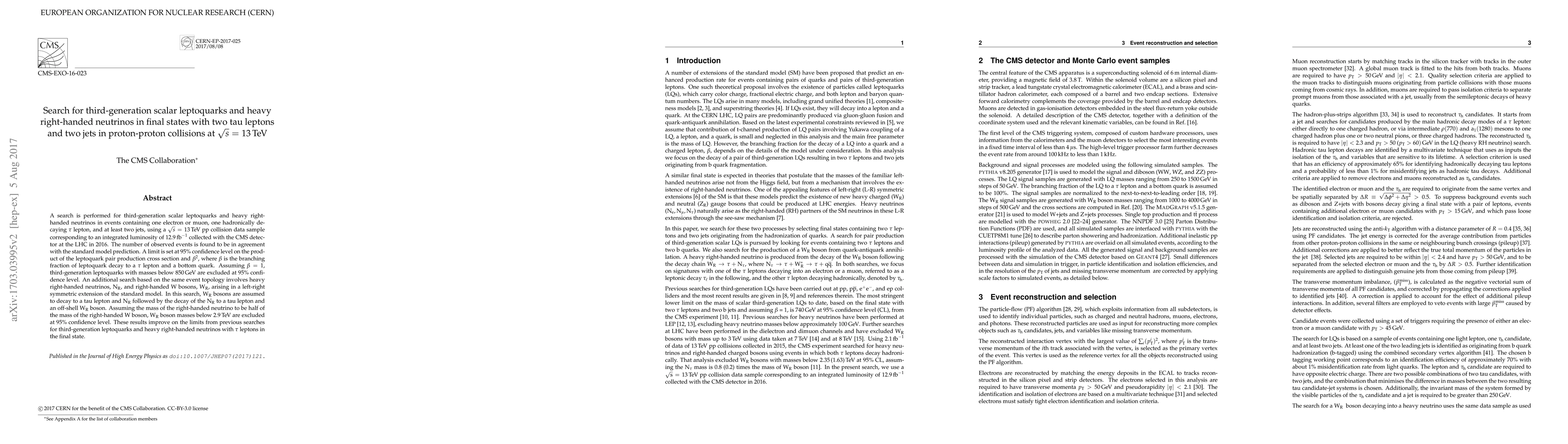 This paper reports a search for third-generation scalar leptoquarks and heavy right-handed neutrinos using CMS detector data from 13 TeV proton-proton collisions. No evidence of these particles was found, leading to new exclusion limits at 95% confidence level for leptoquarks below 850 GeV and right-handed W bosons below 2.9 TeV.